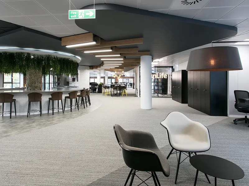 With over 200 members of staff and the average age being 25, it’s obvious why a modern, fun and ‘people-centric’ workspace was in the design brief. Statement architectural elements have been added to further enhance this flow of human connectivity; a 7 foot tall space separates the open office and pantry area without creating a solid wall.