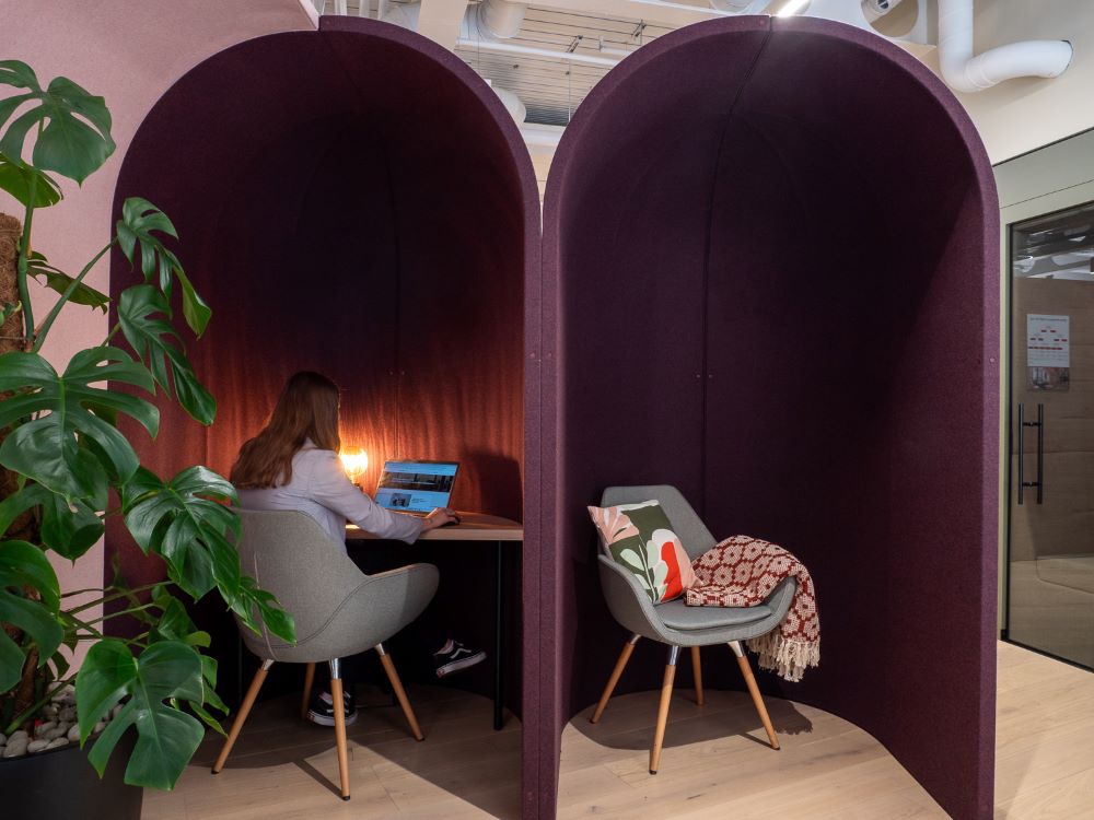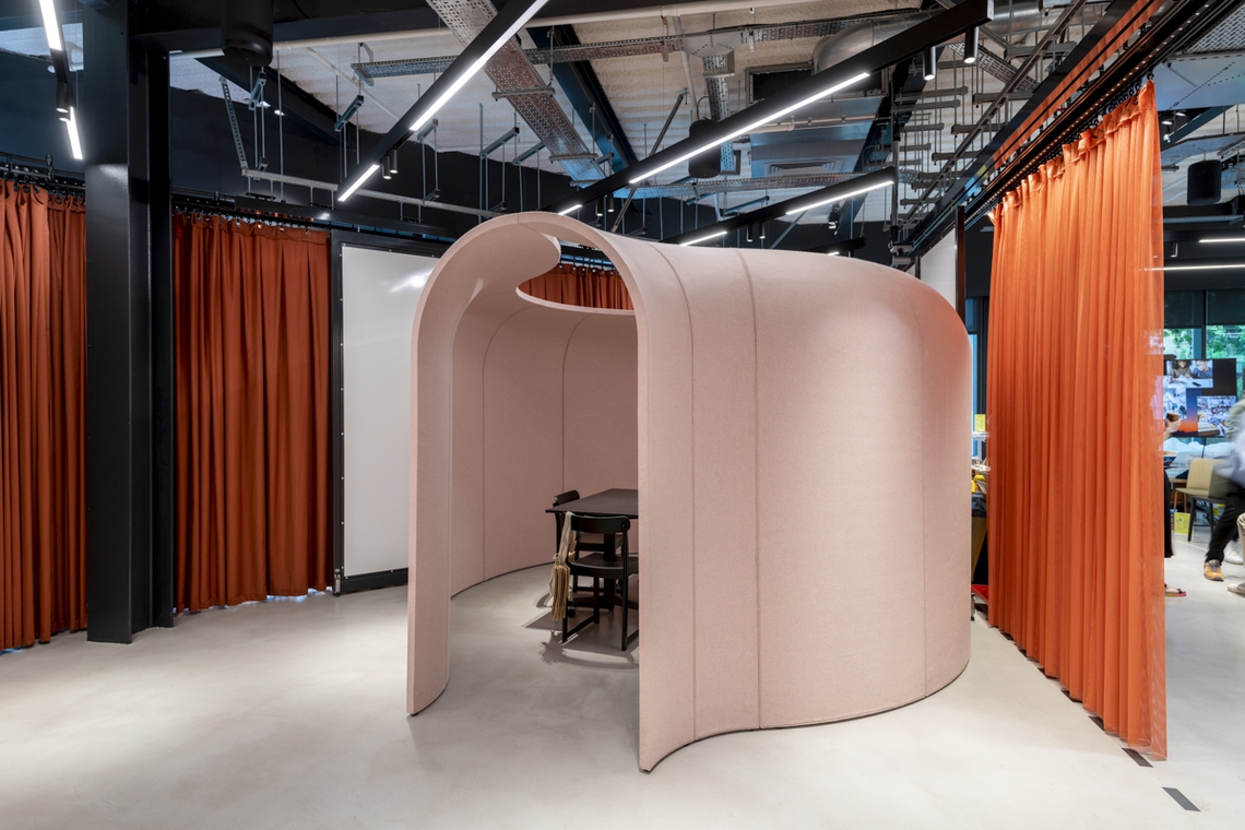 The comfort acoustics and serene environment are particularly beneficial for workplaces aiming to design for neurodivergence, accommodating employees with different sensory needs. Dark fabrics can be used to create deeper, more subdued spaces, shielding users from harsh fluorescent lighting and offering a retreat for the senses.