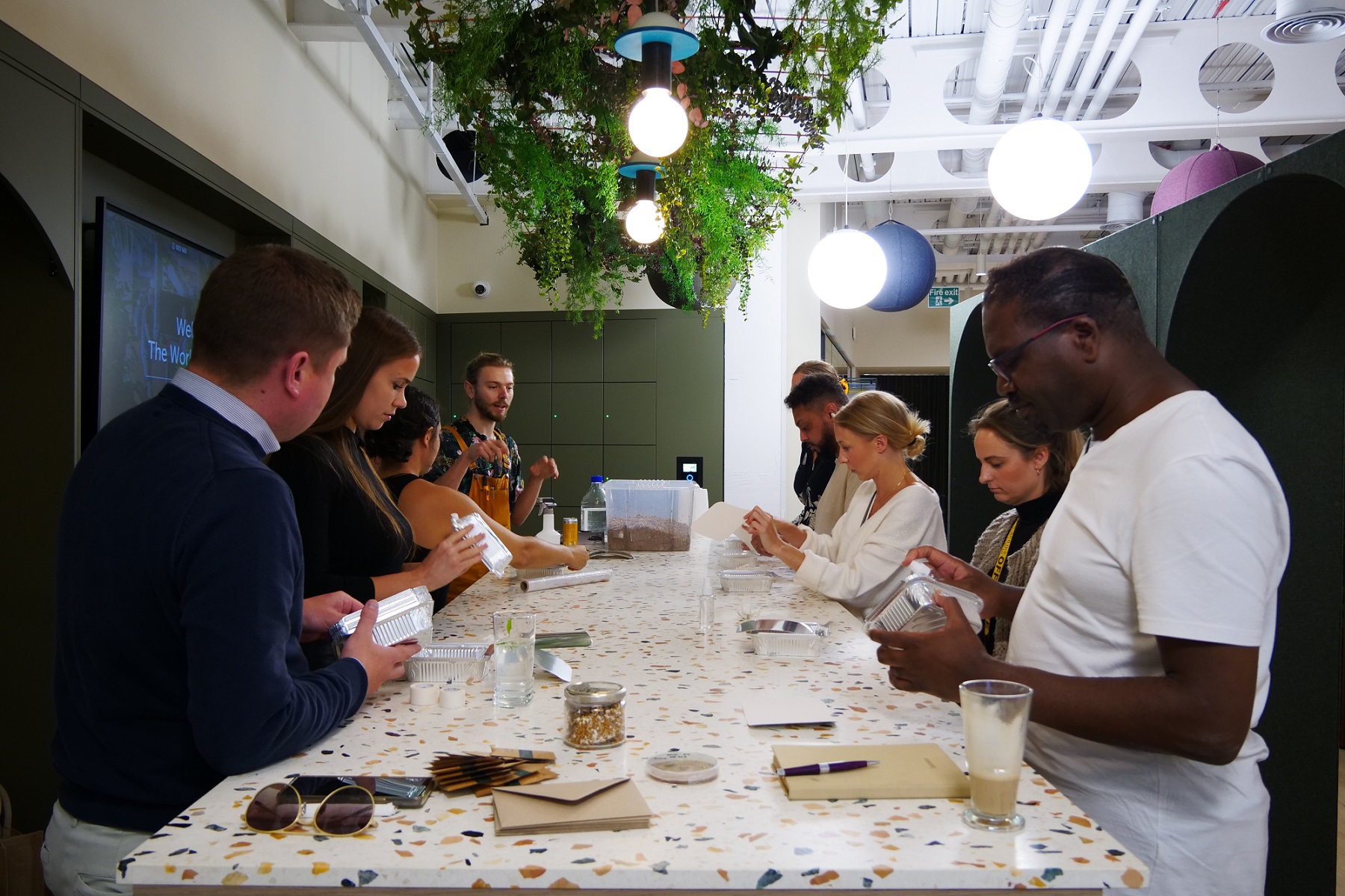 Nature's Potential: Building with Mycelium. We were joined by Osmose Studio for a masterclass on mushrooms, that included a deep dive into the functions and potential of mycelium, a material, emerging in the interior industry as a serious player for the natural furnishing and building of staple ingredients already in the office or home. Guests were then taken through the initial processes of creating a mycelium structure; mixing, molding and sealing their creations, whilst learning about the aftercare and nature of this living material in a hands-on workshop which is the first of it's kind in the UK!