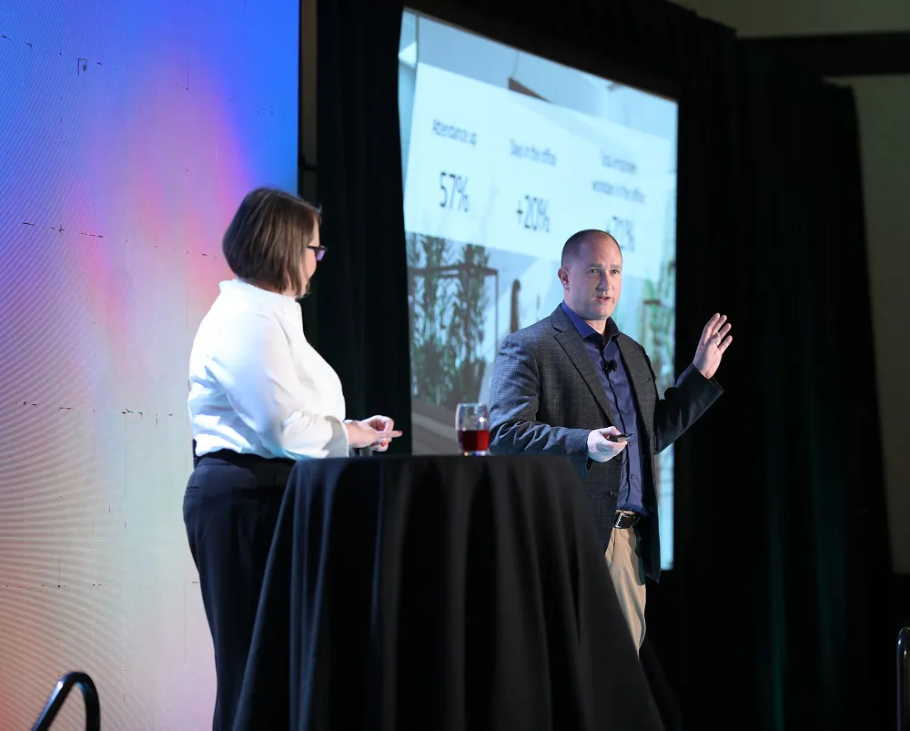 Patrick Hoffman shared insights from Syneos Health, where they view the workplace as a competitive advantage. In a discussion with Jen Sisak (M Moser) called Grit, Gumption and Getting it Done: Keeping Up with the Rate of Change in Today's Workplace, Patrick explained that despite reducing their real estate footprint significantly, attendance has surged by 71% with one of the most utilised spaces being a popular, tech-enabled 4-person conference room/private office with demountable partitions.