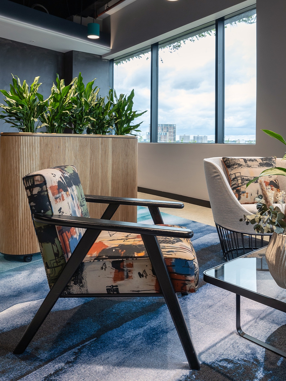 Eden’s towering green facade, featuring Europe’s largest living wall, is a statement piece, home to over 350,000 plants that help absorb pollutants and boost biodiversity. Inside, TLT chose materials with similarly high sustainability credentials, like terrazzo worktops crafted from recycled plastics and upcycled lighting reclaimed from RAF bases and schools. Each element, from the recycled leather in the teapoints to the locally inspired artwork, was selected to reinforce the building’s eco-conscious ethos and socially sustainable heart.