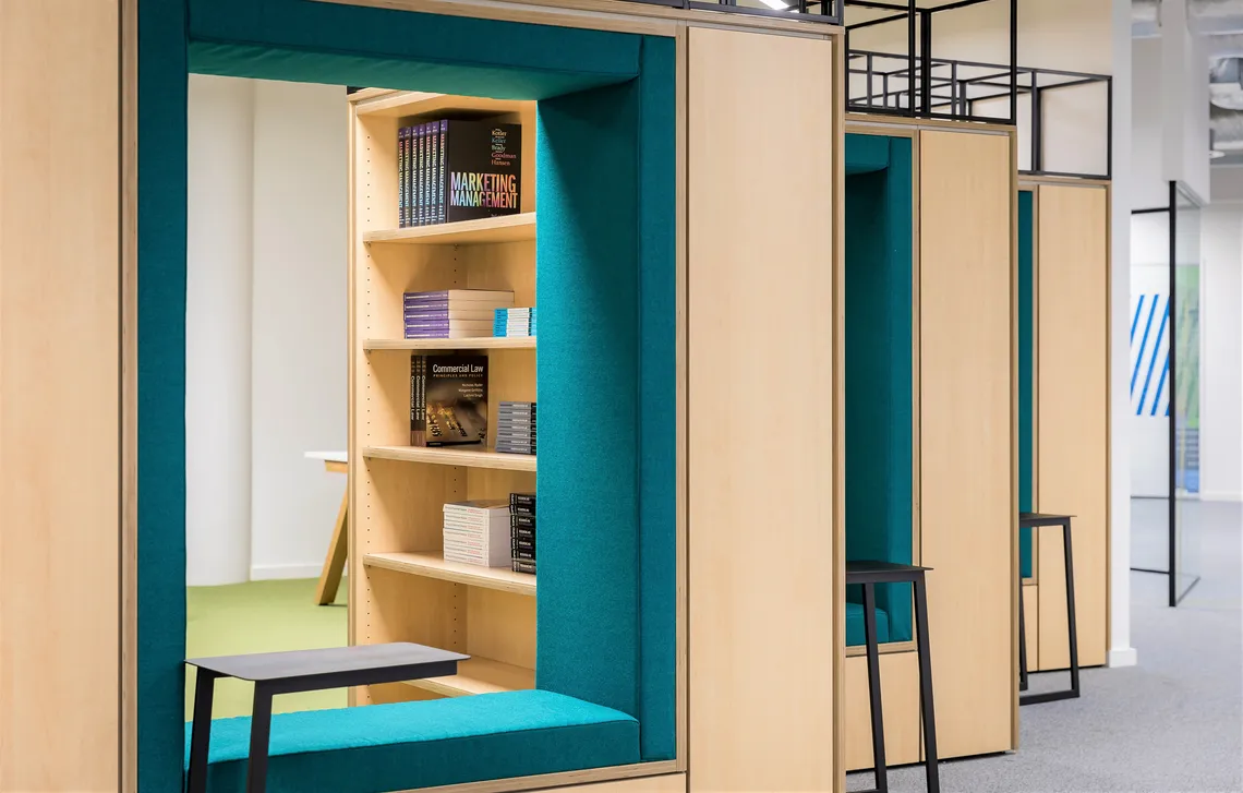 In the impressive library of the University, rows of our Snugglestors provide soft-seating and a secluded study zone as well as serving students with a quiet thinking area. Integrated shelving and the addition of Palisades, laid out in a continuous z-formation, create an impressive literary sanctuary for ARU. Also woven into the design is our Zee Bench Desking, a uniquely-shaped, raw timber bench desk. It's a premium modular desk system with a softer, more bespoke look. Connected to the runs of Snugglestors and shelving, with the addition of a whiteboard upstand, the Zee Bench Desk provides the flexibility to choose between focussed individual working and a collaborative hotspot.