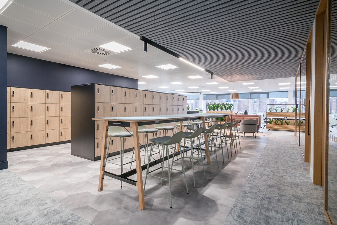 Employee experience is enriched further with a personal storage solution which runs alongside agile working. Banks of Lockers are an extension of the D&G brand, highlighting a soft natural look, a calm environment which attracts and retains talent. Textures and colours are understated, but bursts of colour add inspiration and stimulate creative thought. Strongly linked to the sympathetic design is the natural light and biophilia which uplifts mood and assists crucially with employee wellbeing.