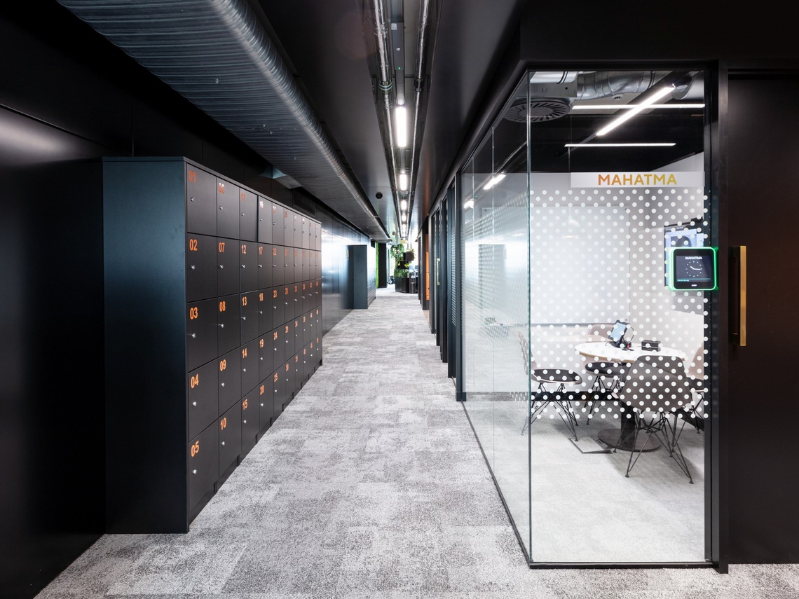 The design brief was to create a inspiring space which would allow the team to be productive and happy whilst at the same time reflecting the vibrant culture of the workforce. It was important the space provided zones suited for carrying out different tasks, with adequate breakout and private working areas and we were pleased to provide our Palisades Grid zone dividers to facilitate this. A bank of our freestanding Hotlocker lockers was also used, customized to blend in with the firm's colour scheme of muted shades of black and grey, with bursts of vibrant orange in the vinyl numbering.