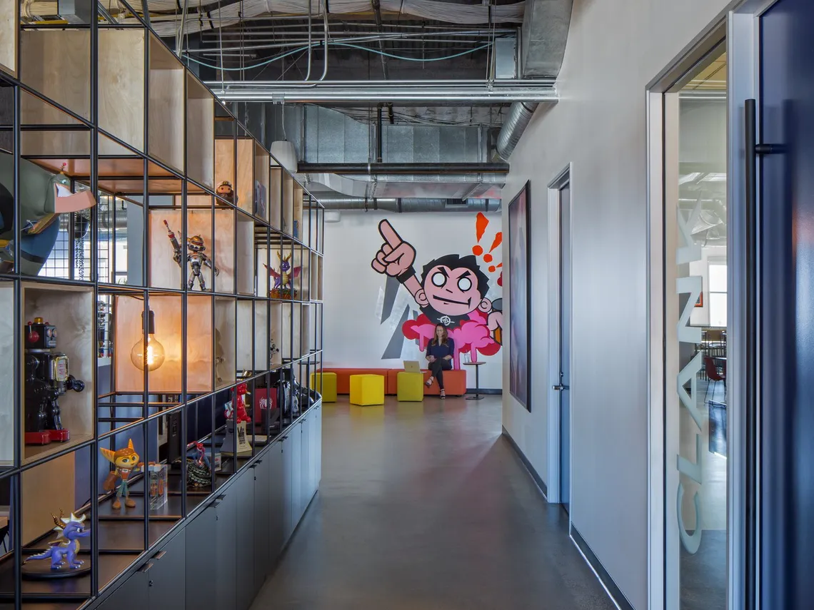 Los Angeles architects OKB were chosen to design their new home, and we were pleased to provide our Palisades Grid system for the open-office area. Here the Palisades Grid is used to mark out a walkway, to provide some cabinet storage space, and, most importantly, to display models of Insomniac Games’ best-known characters, from Spyro the Dragon to Ratchet & Clank.