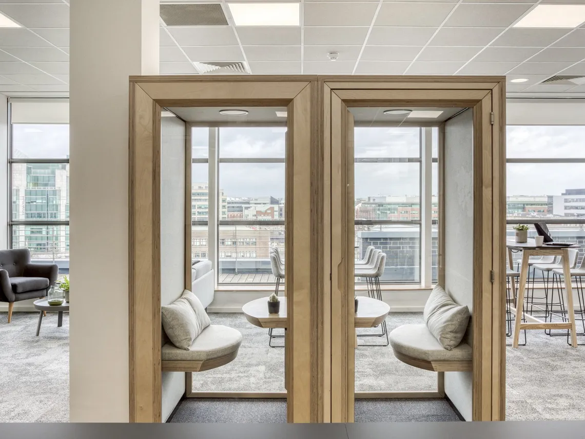 As specialists in the “flexible workspace”, Knotel chose to install a single user pod from our Residence range as a quiet space in the heart of the busy office. This soundproof, acoustically tested pod provides a quiet spot where two people can sit down for a private meeting; while its glass walls ensure that it’s full of natural light, and still has sweeping penthouse views of the city of Dublin below.