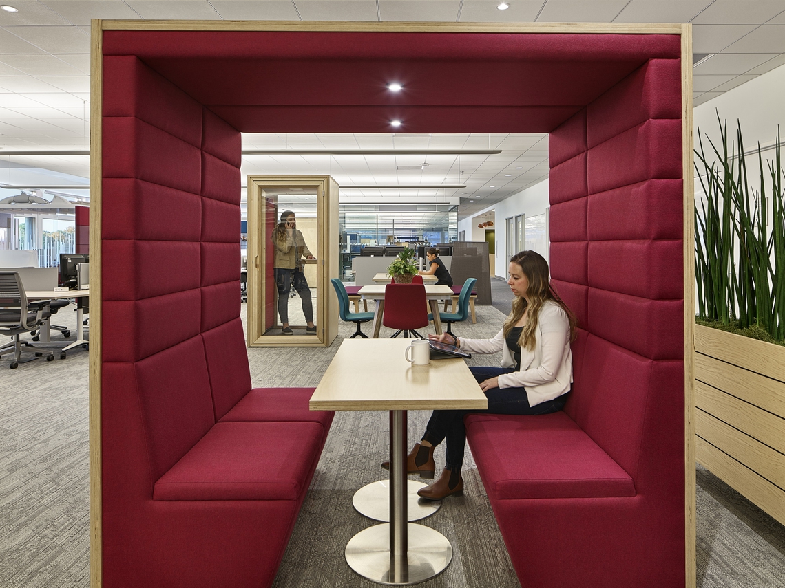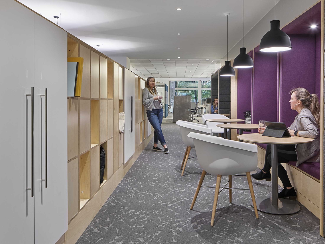 Using an agile-based, push-button lock, means staff can simply walk up to a locker and assign it to themselves, supporting the company's agile and hybrid based working. With a quick glance, users can see via the lock’s button position, if a locker is free or in-use. Finished in a polished birch ply, the lockers and integrated alcoves, reflect the natural and warm tones of the design schematic throughout the space. Finally, the lockers have been manufactured to allow for the company's own facilities team to move the banks of lockers with ease, enabling future flexibility to be built into the space.