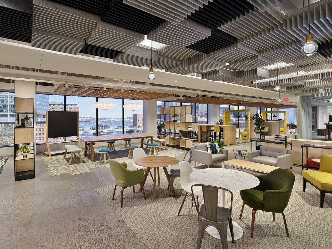 In another nice design touch, the long office space is artfully divided into zones by standalone blocks of our Palisades system, but also by our Railway Carriage meeting pods. Here the open-sided Railway Carriages perform a variety of roles: they offer more intimate spaces for solo or two-person work, they function as zone dividers, and they frame a cinematic view through the centre of the office. Furthermore, they allow the building’s long glass wall to be left unobstructed, making the most of the sweeping views of Boston’s famous harbour.