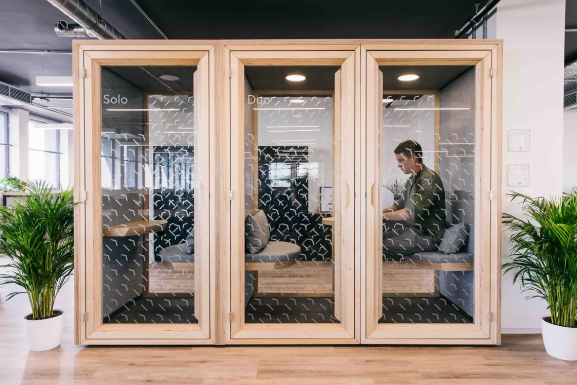With a strong commitment to sustainability and wellbeing, we were pleased to supply our Residence booths and a curated selection of chairs to this environmentally-friendly design. Using custom graphics on the glazing, our Work pod became a 'Solo' and the Meet pod a 'Duo'; the perfect way to customize our products to reflect the brand of the user. These pods provide the necessary solitary space within the buzz of the office, for concentrated work or a private phone call. Finally our task chair, being 95% recyclable, not only supported their eco-conscious focus, but the chair's ergonomic design provides comfort and ensures employee wellbeing.