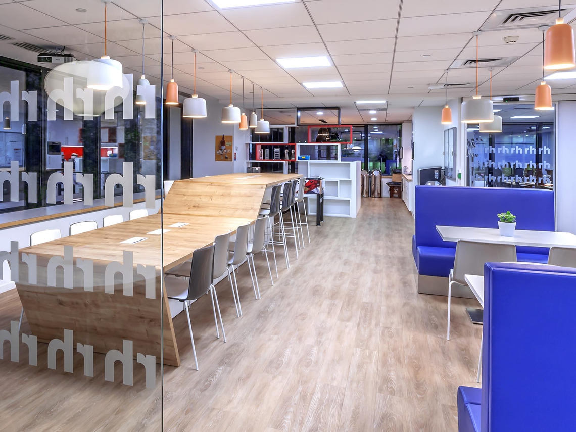 Arch Design placed a cafeteria at the heart of the space, where it could serve as both a relaxation and a meeting area, and surrounded it with a variety of meeting spaces suited to small working groups. As such, Spacestor were happy to install a run of three Railway Carriage meeting pods upholstered in blue with alternating light grey or orange; and rather harmoniously, the square arches of these Railway Carriages mirror the form of the famous Grande Arche de la Défense that has long been the symbol of the neighbourhood. Furthermore, we also provided a tower of HotLockers for employees to store their personal effects in, contributing to the making of a nice, welcoming workplace that can adapt to the needs of Robert Half International’s staff.