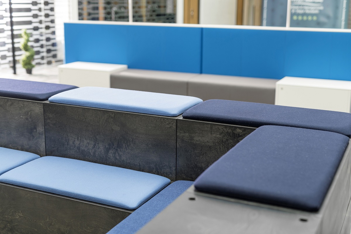 The main attrium is designed to be modular based and Bleachers bridge the gap between a meeting room and auditorium. Opportunities to adapt the configuration to meet any situation engages the user as they create their own personal collaborative space. In a dark stained ply, this flexible seating asserts itself, but is balanced by the preservation of the natural wood grain, keeping the material true to its organic form.