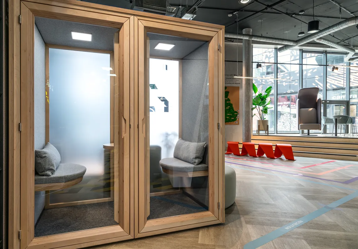 Products were chosen to address specific needs in the Education sector and help create dynamic, adaptive, sustainable spaces for the future of learning and work. That’s why Wagstaff chose our Residence range, to provide an agile workspace for all users. Our ultimate video conferencing booth, Residence Connect, features a spacious interior designed for comfort. Users can enjoy an ergonomic task chair, adjustable lighting, ventilation, and desk height, all seamlessly working together to provide the ultimate conferencing experience. With DDA compliance and inclusivity in mind, these features are key to contributing towards an inclusive environment for higher education. Additionally the pod has a compliant door width of 32" and a push button to open and close the door for ease of acess.