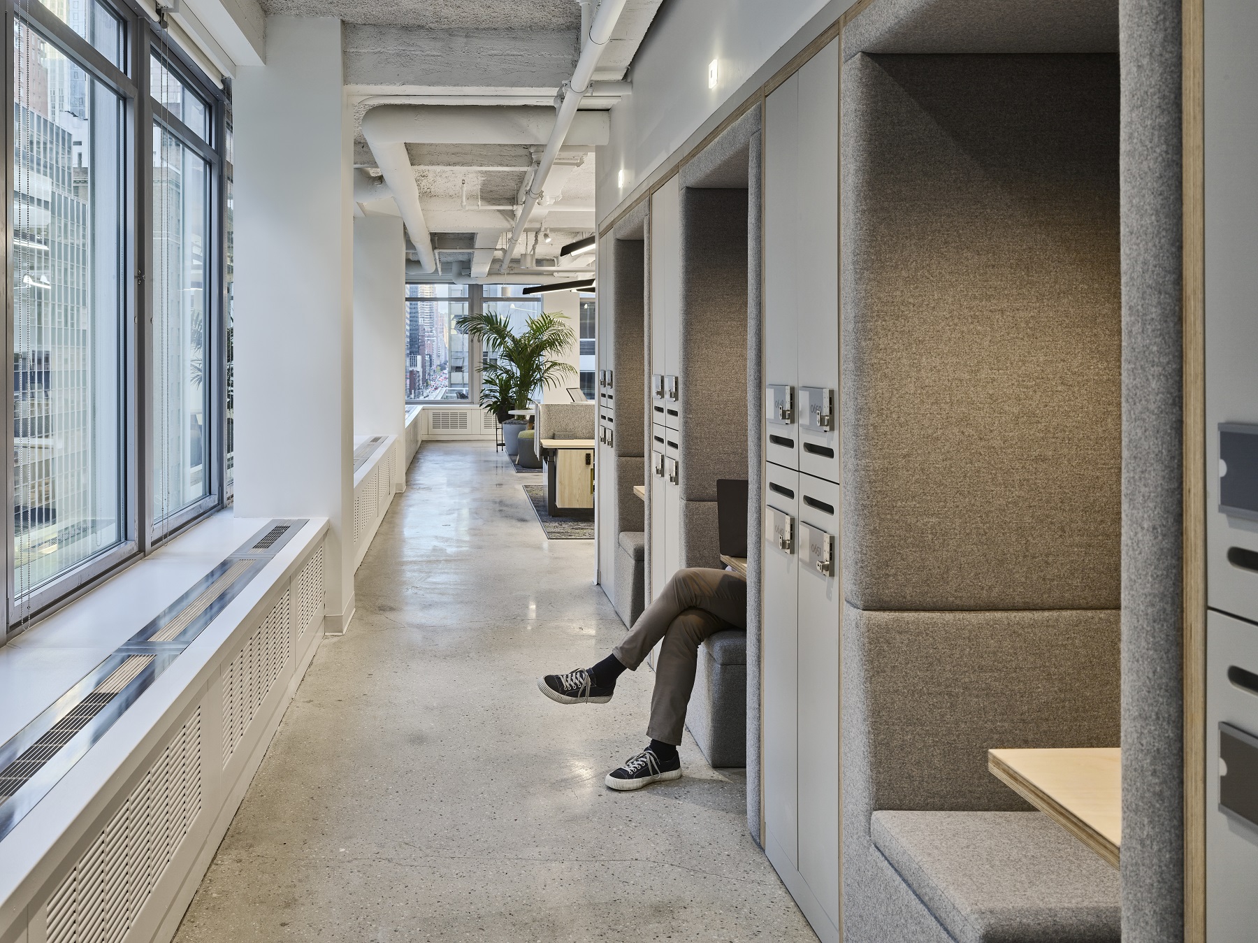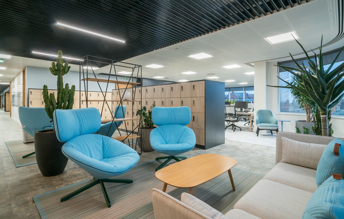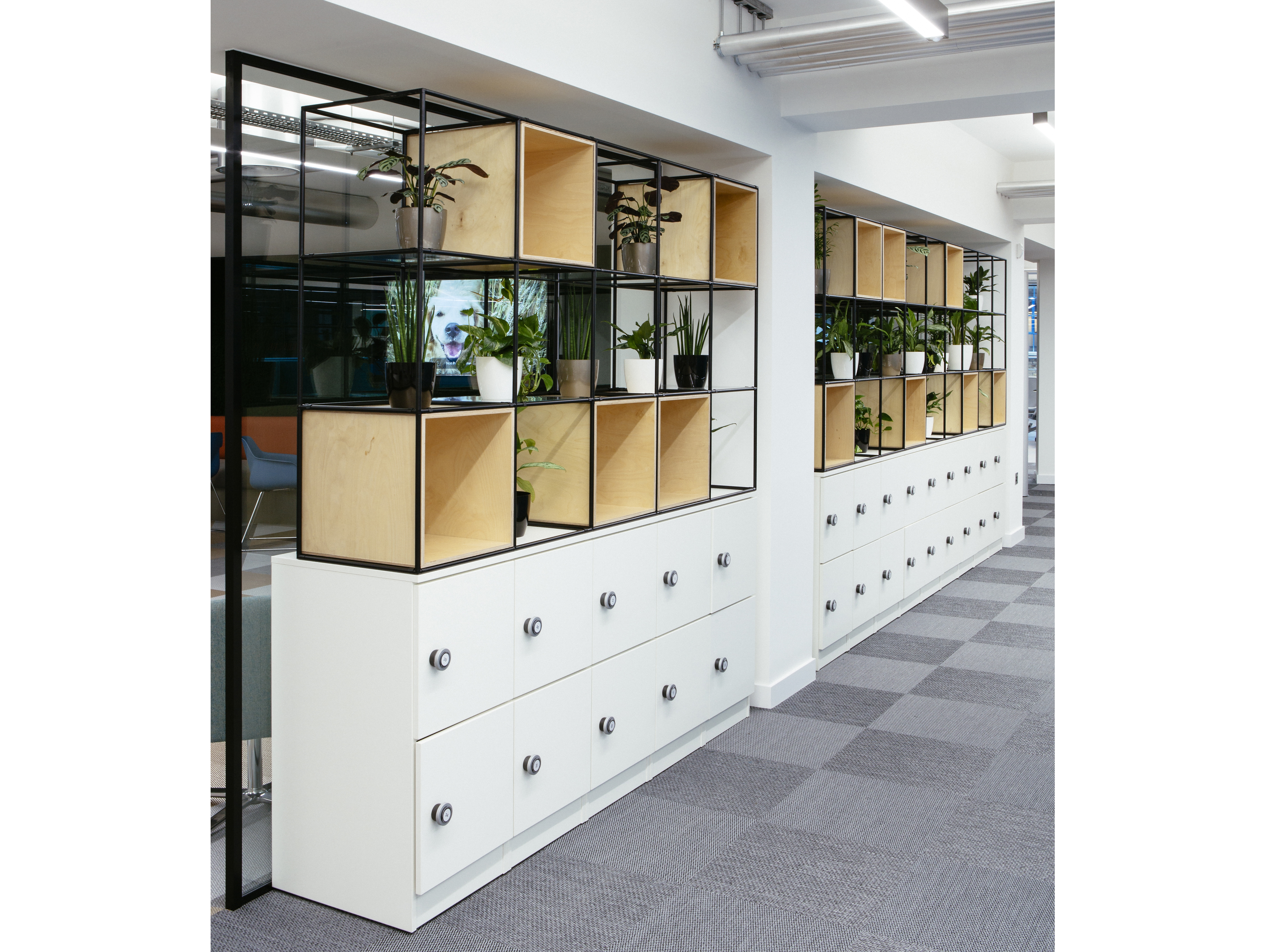 Combining the needs of an agile workspace at Arthritis Research UK, a variety of zones and biophilia, white HotLocker banks were integrated with Palisades Grid and used throughout the office to create zones for collaboration, relaxation and social gathering.