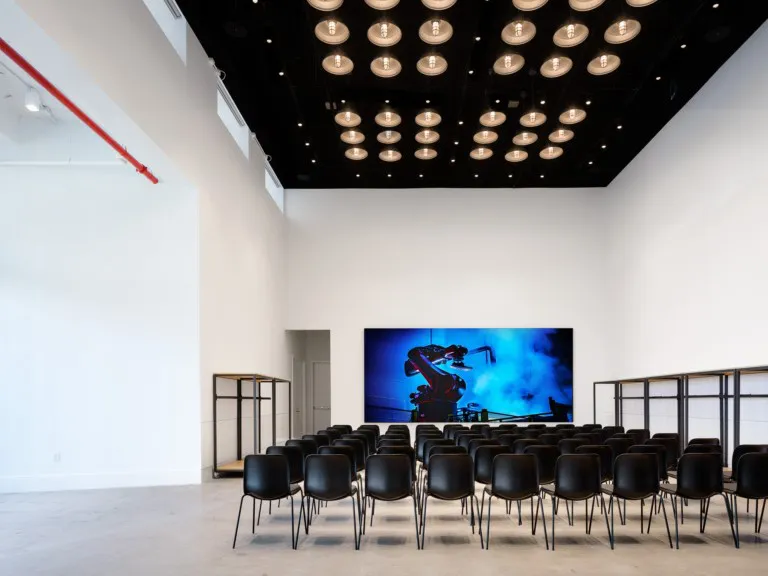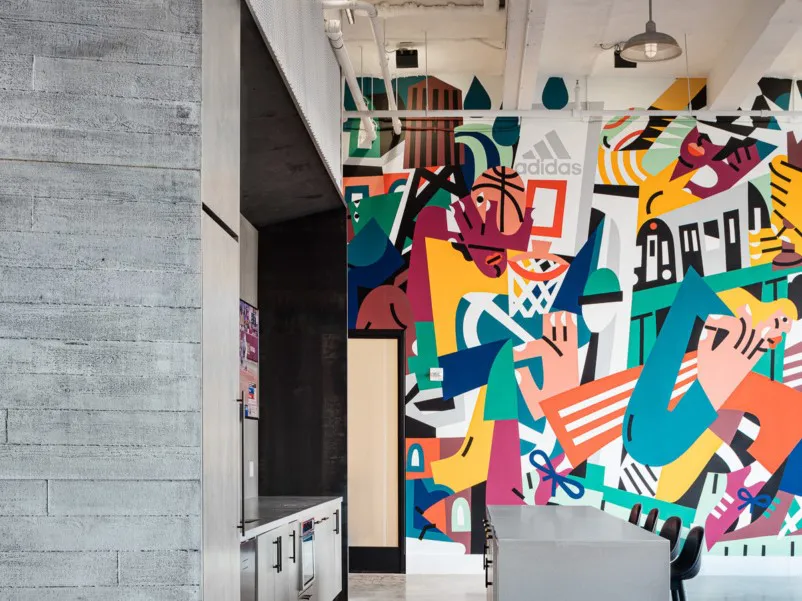 To nurture creativity and innovation the design takes inspiration from sports, speed, and creator culture. Stadium light fixtures illuminate the showroom corridors, with super-graphic wayfinding numbers recalling arena signage. The central elevator and service core is clad with corrugated metal panels, custom perforated for acoustic performance and set at the sixty-degree angle of the famous Three Stripes. The industrial language of the former factory is preserved and celebrated by up-lighting the masonry piers and exposing the high ceilings, keeping mechanical and other building systems carefully organized and coordinated. A palette of expanded metal, hot rolled steel, cast concrete, and vibrant site-specific art resonates with Adidas’ vision of authenticity and urbanity.