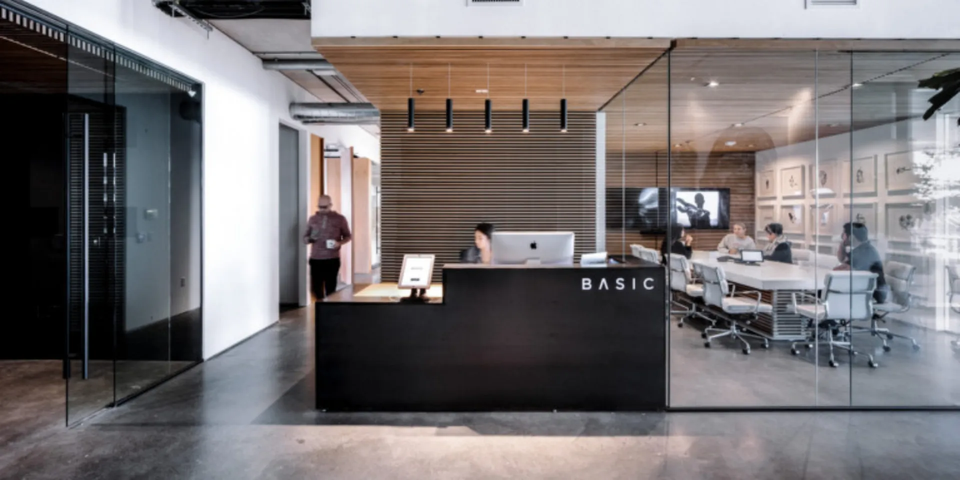 Avec la possibilité de commencer de zéro dans un espace tout neuf, BASIC et ses partenaires en design ont créé des bureaux qui représentent vraiment leur marque avec son esthétique en utilisant du mobilier personnalisé ainsi qu'une palette de couleurs et de matériaux claire qui comprend beaucoup d'acier, du chêne blanc et des inclusions de noir.