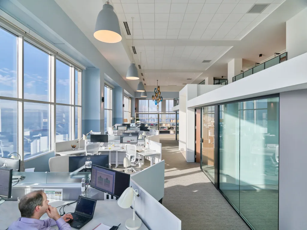Global Management consultants, the Boston Consulting Group asked SkB Architects to evolve their new Seattle office space with a design challenge to create a flexible approach to workspace without sacrificing the incredible 300-plus-degree vistas of the surrounding city and Elliott Bay. The design is based on spatial compression and release, the blurring of typical work-style boundaries, and the palpable experience of space. With a 2:1 work ratio, the 24,000 sq ft space needed to flex and accommodate their open-ended, non-assigned work environment.