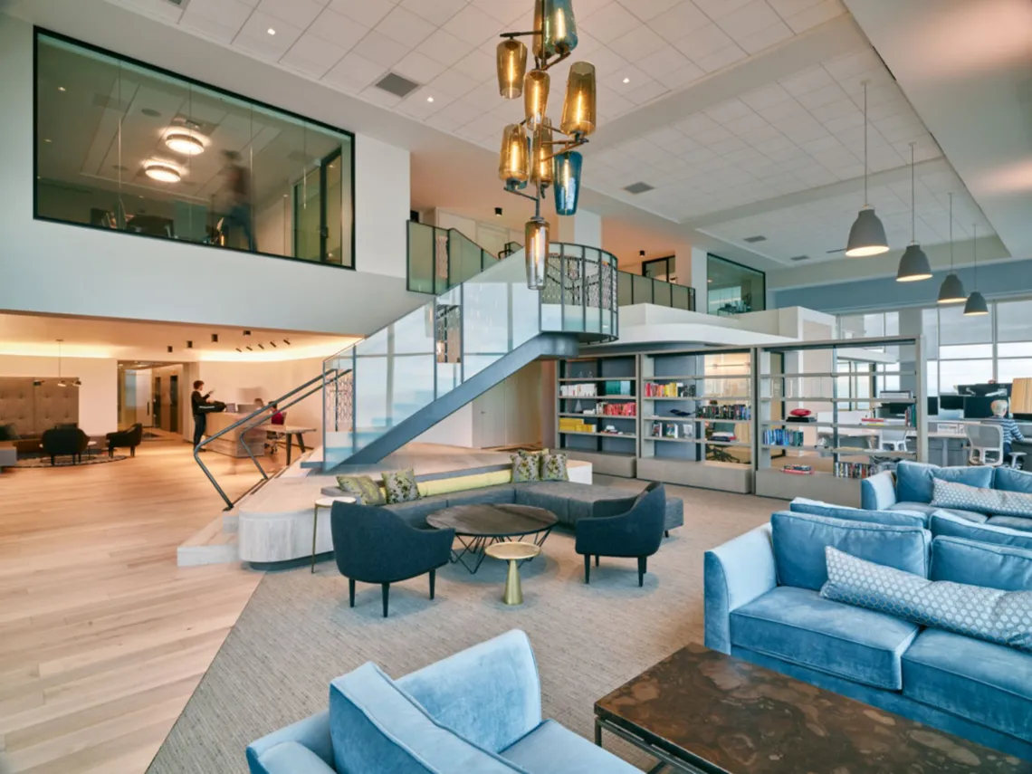To meet these needs, the space contains an open work lounge, a multi-use work café-style break room, and several meeting/focus spaces. A mezzanine-style second floor that holds the board and client meeting rooms sits within the double-height office which accommodates a wide variety of traditional and non-traditional work spaces. These include an open work lounge, a multi-use café-style break room and several meeting and focused work-spaces.