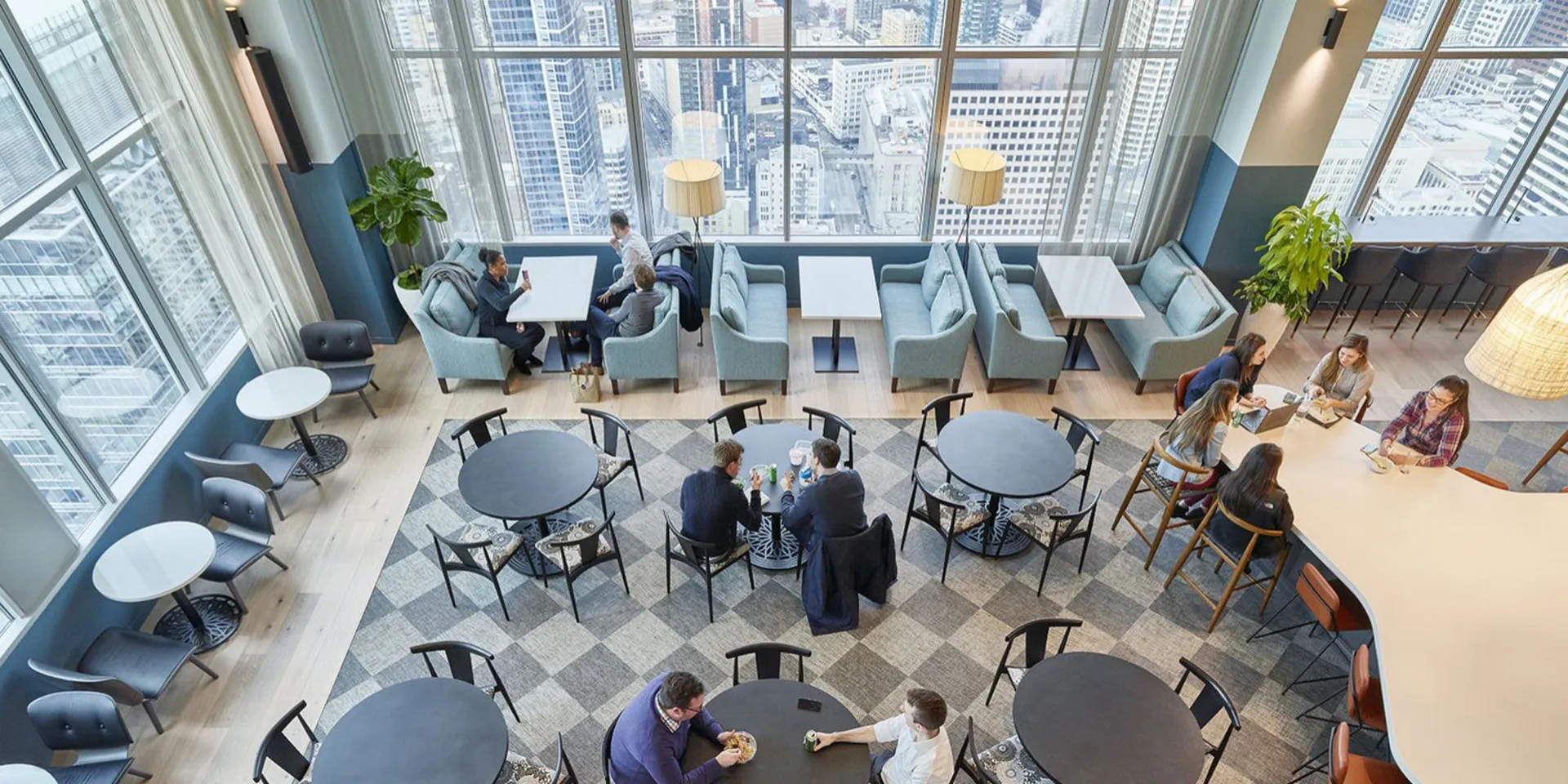 In a nod to a bit of cheeky hospitality, a prohibition-era speakeasy bar hides behind a door made to blend in with the café casework. Vintage lighting, luxuriant bar stools and tin ceiling tiles are featured, and flexible furniture arrangements transform the area to accommodate large events and all-staff meetings.
