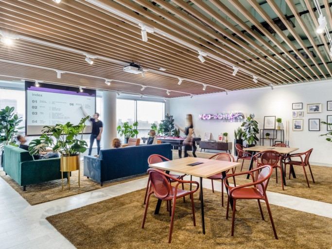 L'endroit le plus vivant de ces bureaux est peut-être l'espace de coworking associé à une salle à manger, une cuisine et un bar de style, au cœur de la société. C'est un lieu pour des réunions plus importantes ou des discussions informelles. Vous pouvez y prendre un café, jouer au billard, discuter ou simplement décompresser. Un si grand espace partagé multifonctions agit comme un catalyseur de la créativité, renforçant les liens individuels entre les employés, une chose vitale dans la culture moderne des entreprises.