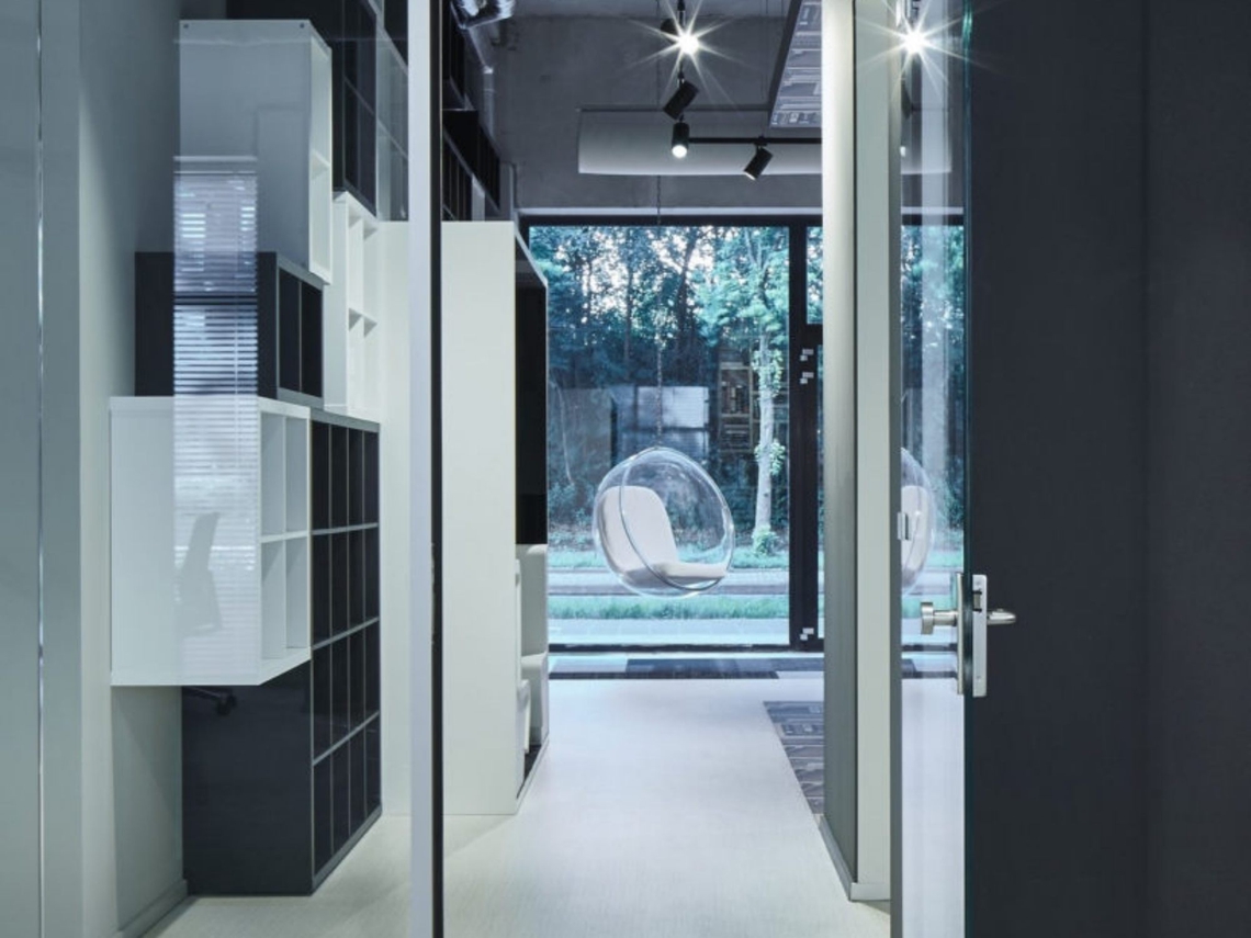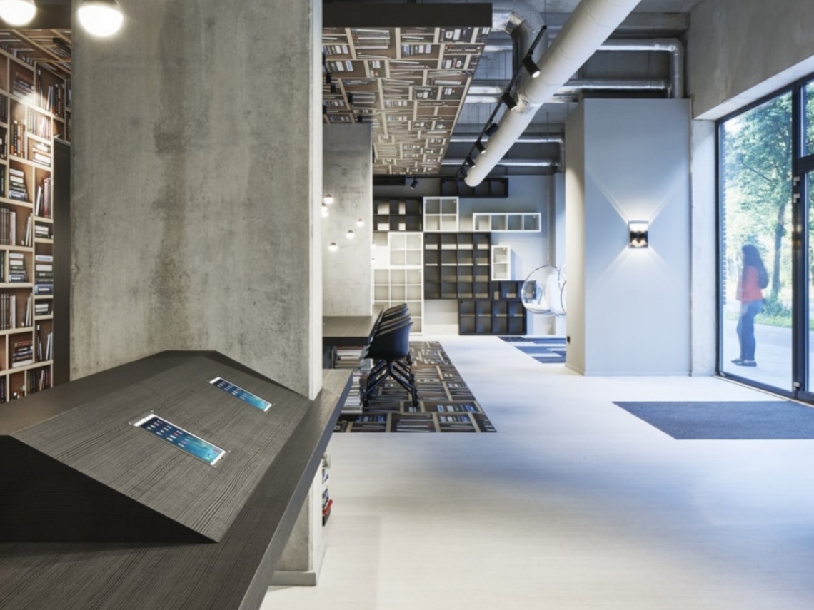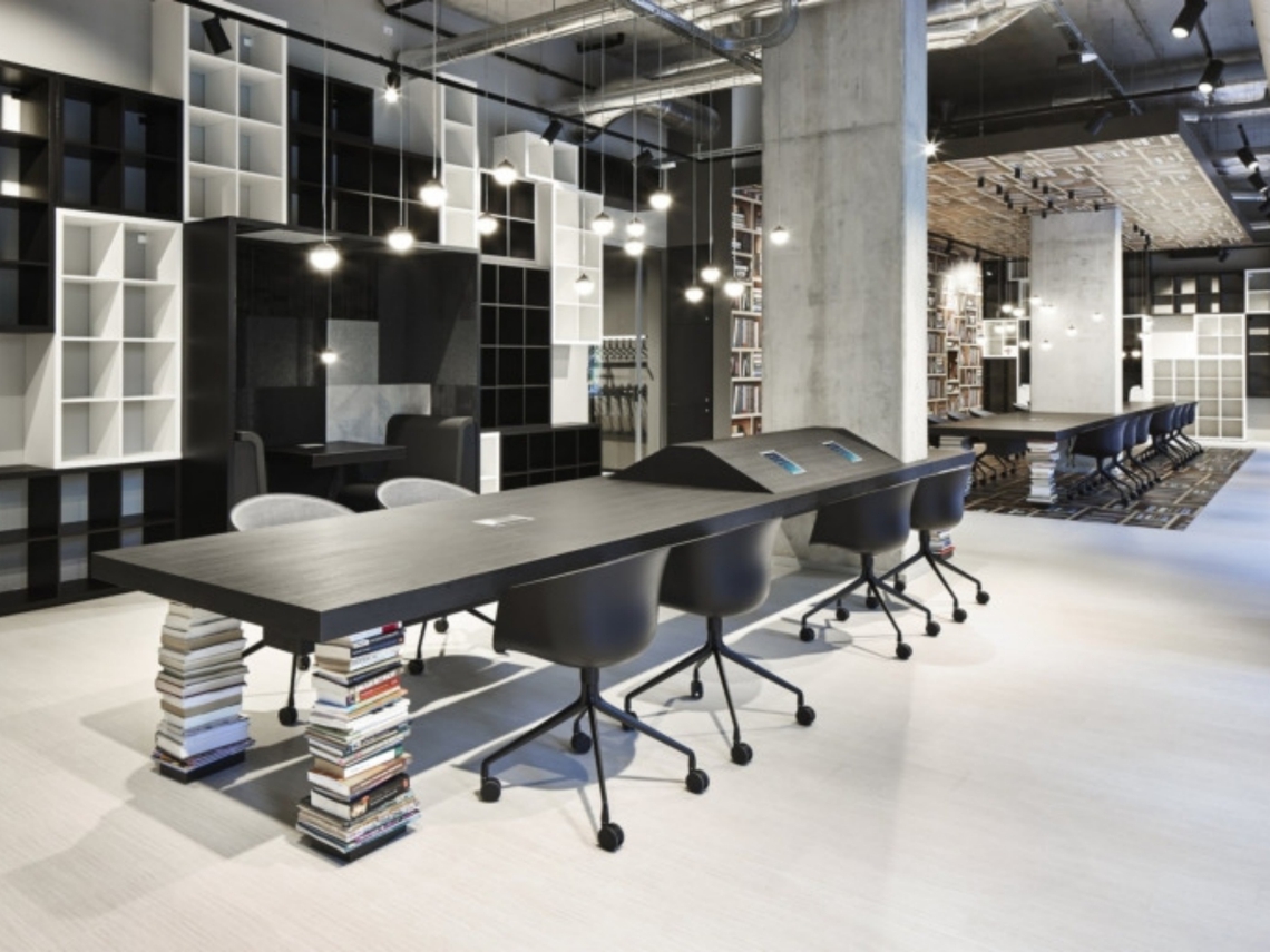 Les magasins de livres doivent maintenant faire plus que jamais face aux rapides évolutions des besoins du marché. Le concept de ce magasin de livre est beaucoup plus centré sur l'espace de rencontre, un espace flexible où l'on peut travailler, se rencontrer et acquérir de la connaissance entre les étagères à livres "vides" dans un espace attrayant. Des espaces de travail et de consultation sur de larges tables ont été positionnés au centre de la pièce et des zones d'assise en forme de double coupé intégrées dans les murs. Des chaises bulles qui attirent le regard ont été utilisées dans les fenêtres, insistant sur l'utilisation ouverte et flexible de l'espace de travail. Des meubles en noir et blanc de différentes dimensions ont été installés pour créer une ligne d'horizon sculpturale sur le mur.