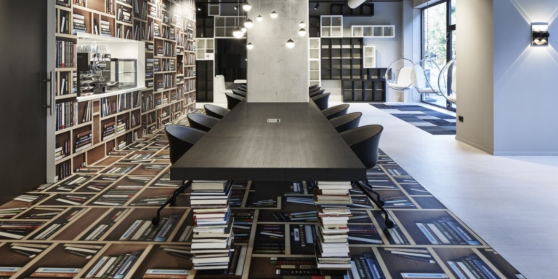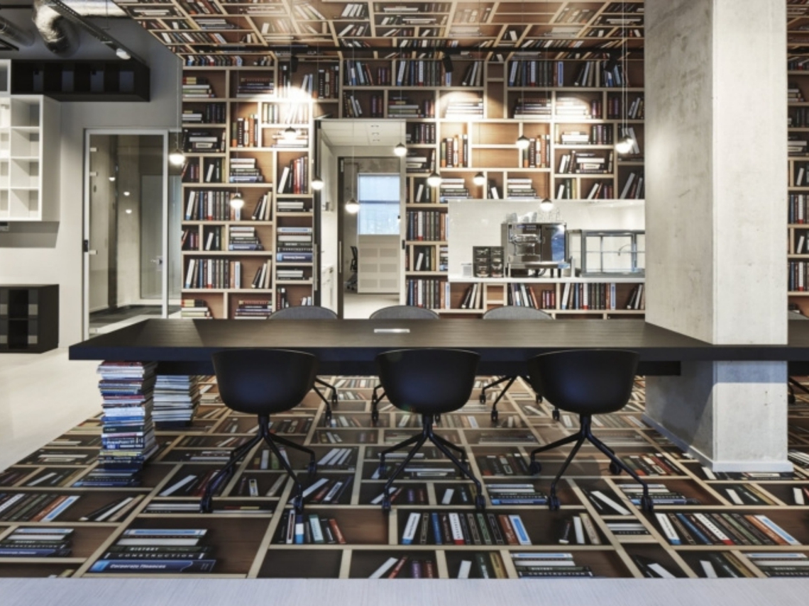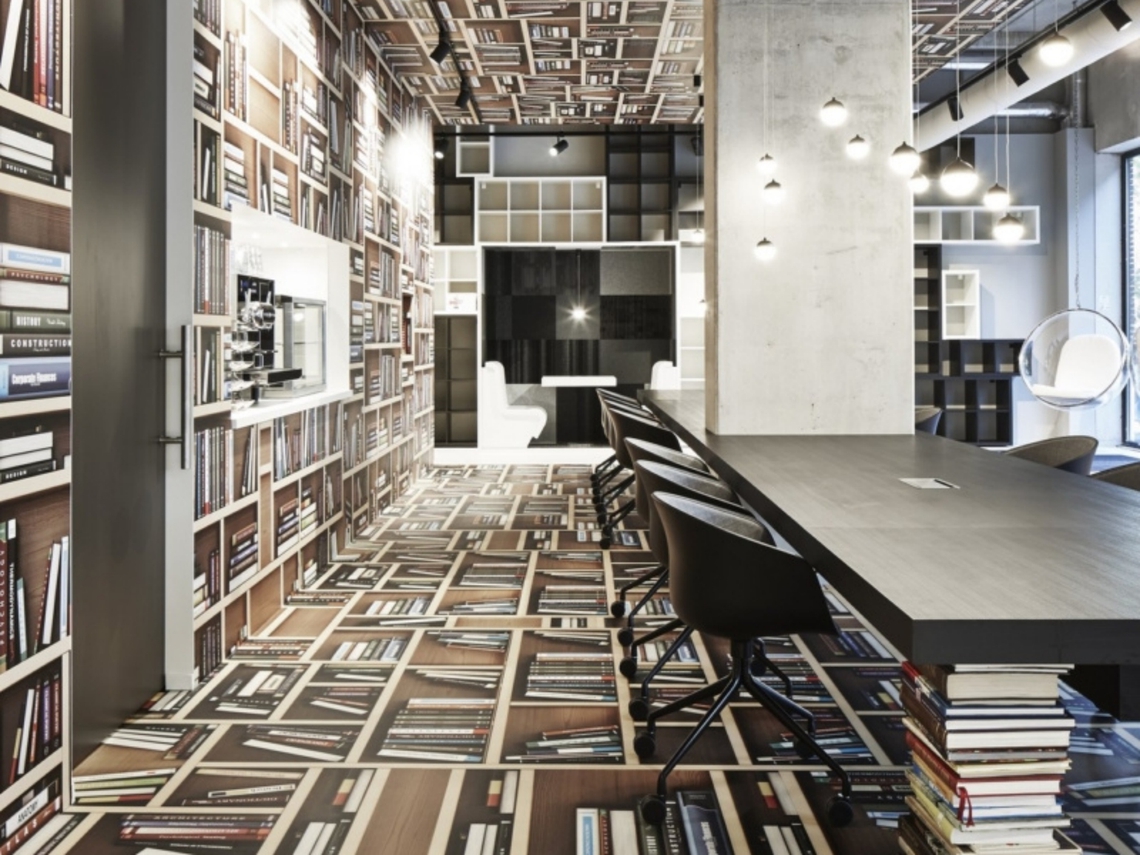 Parce que le monde des livres d'aventure, de savoir et de science n'est pas en noir et blanc, l'impression d'une immense bibliothèque colorée a été utilisée pour recouvrir le sol, le mur et le plafond, la seule touche de couleur dans l'espace. Le magasin de livres et les bureaux sont séparés par une zone de facilités où se trouvent la cuisine, les toilettes et les locaux techniques. Un concept d'alimentation spécial basé sur une nourriture saine et durable comprenant des spécialités du monde entier est mis en place, permettant au gens de travailler dans le magasin de livres, d'y prendre un repas sain ou de le réserver pour une réunion.