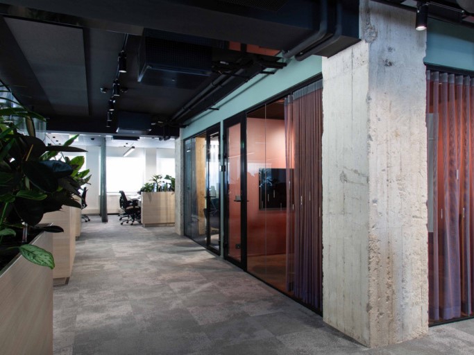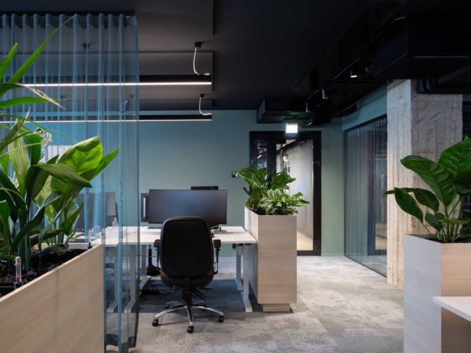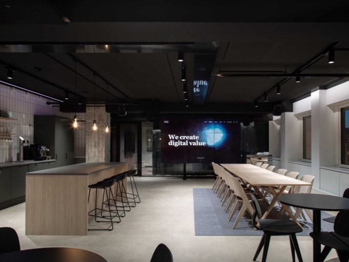 Séparés en deux côtés distincts, les bureaux possèdent une zone pour le travail en concentration et une autre pour le travail en commun. Avec un concept inspiré de la terre et de l'espace, l'atmosphère planétaire ressort avec le choix du mobilier et de l'éclairage. L'idée dans les deux zones de travail était d'encourager la collaboration et le travail productif dans différents espaces, permettant aux employés de travailler aussi bien dans des salles de réunion traditionnelles et, de manière plus informelle, dans des salles d'équipe plus agréables. De plus, les invités dans cet espace peuvent entrer directement au cœur des bureaux et s'imbiber immédiatement de la culture du travail.