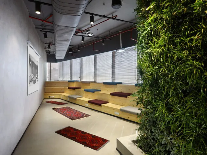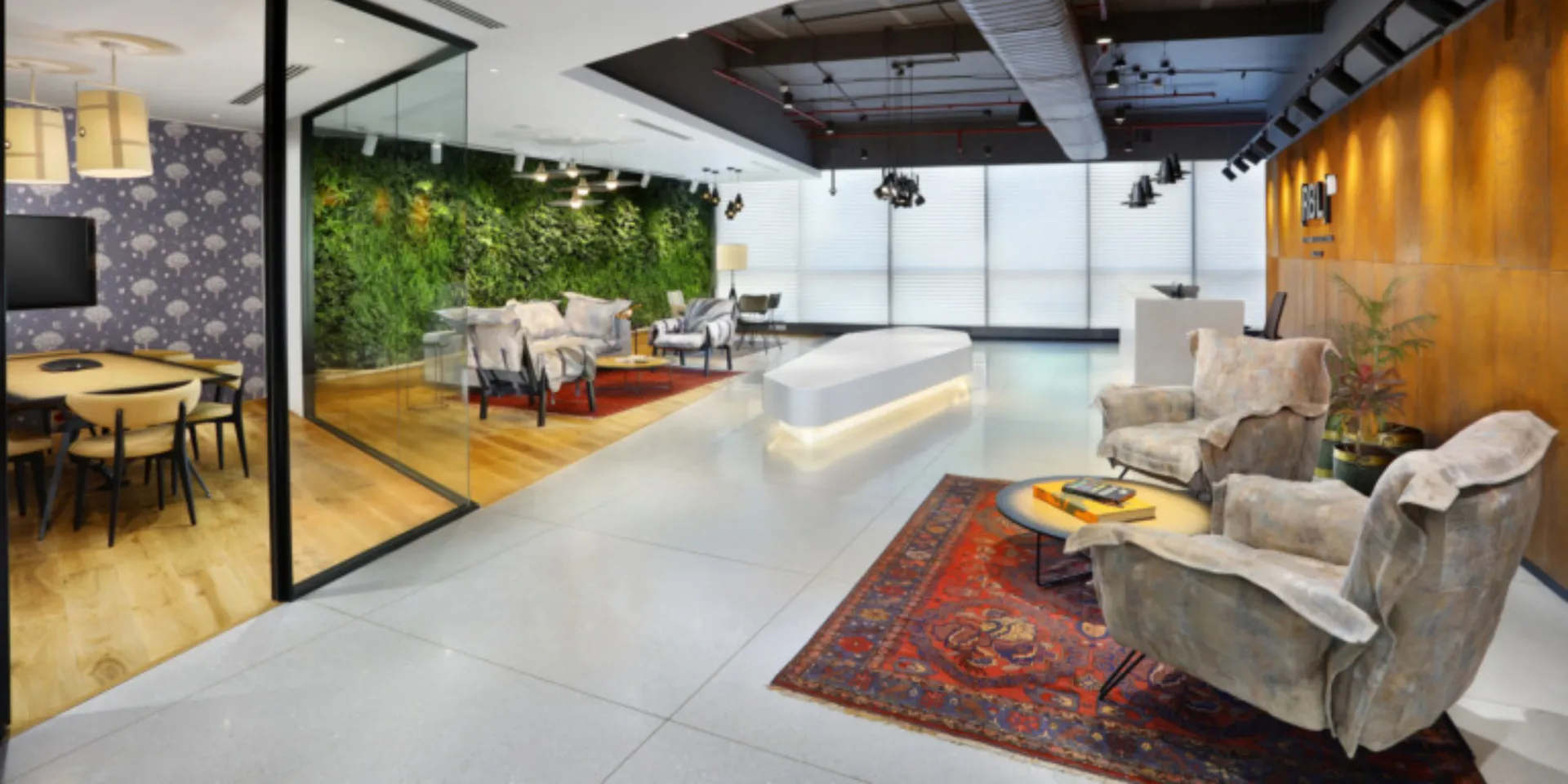 Trouver des moyens de partager l'espace dans un bureau en open-space est essentiel. Dans les bureaux de RBL, des écrans en métal et en bois ont été utilisés pour diviser la surface. En même temps que leur aspect fonctionnel, les différentes textures aident à donner un caractère unique à chaque recoin. De plus, des bureaux vitrés placés en position centrale et des salles de réunion collaboratives ont aidé à rompre la monotonie d'un grand espace, créant des espaces privés tout en gardant cette impression d'ouverture.
