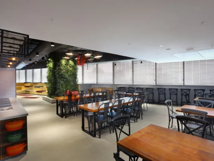 En plus de son aspect et de son ressenti, la façon dont un espace fonctionne peut faire qu'il ressorte par rapport au coin à côté. Le Hall Central des bureaux de RBL en est un exemple. Avec des murs de verre, il n'est pas visuellement séparé de la zone de travail environnante mais il est confortable et offre une intimité acoustique à l'espace. La cafétéria est un autre exemple de zone fonctionnelle différente. Avec des plantes vertes, un mur personnalisé fait de blocs de bois imprimés non utilisés et une zone d'assise en gradin ouverte confortable, l'espace se dédouble en café où travailler et un merveilleux endroit où s'installer pour une heure ou deux avec son ordinateur portable et une boisson fumante.