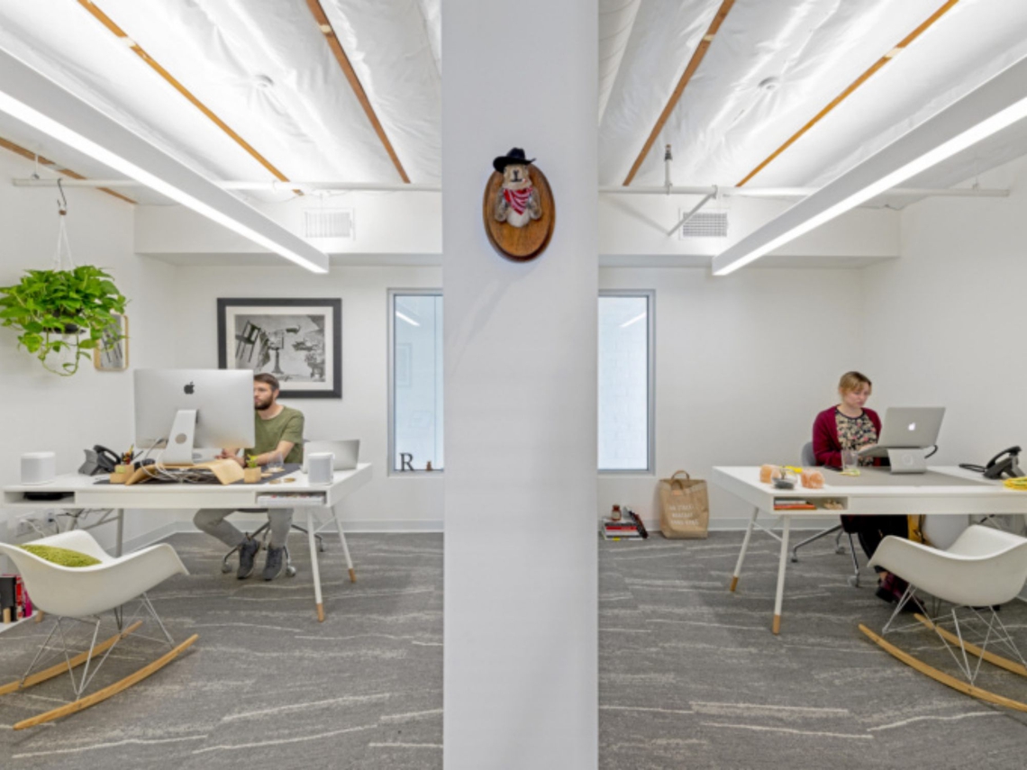 The program brief needed to address dedicated work areas for 30 animators, 6 producers with 4 private offices, 3 editing suites, 2 conference rooms, 3 new restrooms, a large and high clear area for a green screen mockup shoot area, a central pantry, a lounge and a flexible workspace.