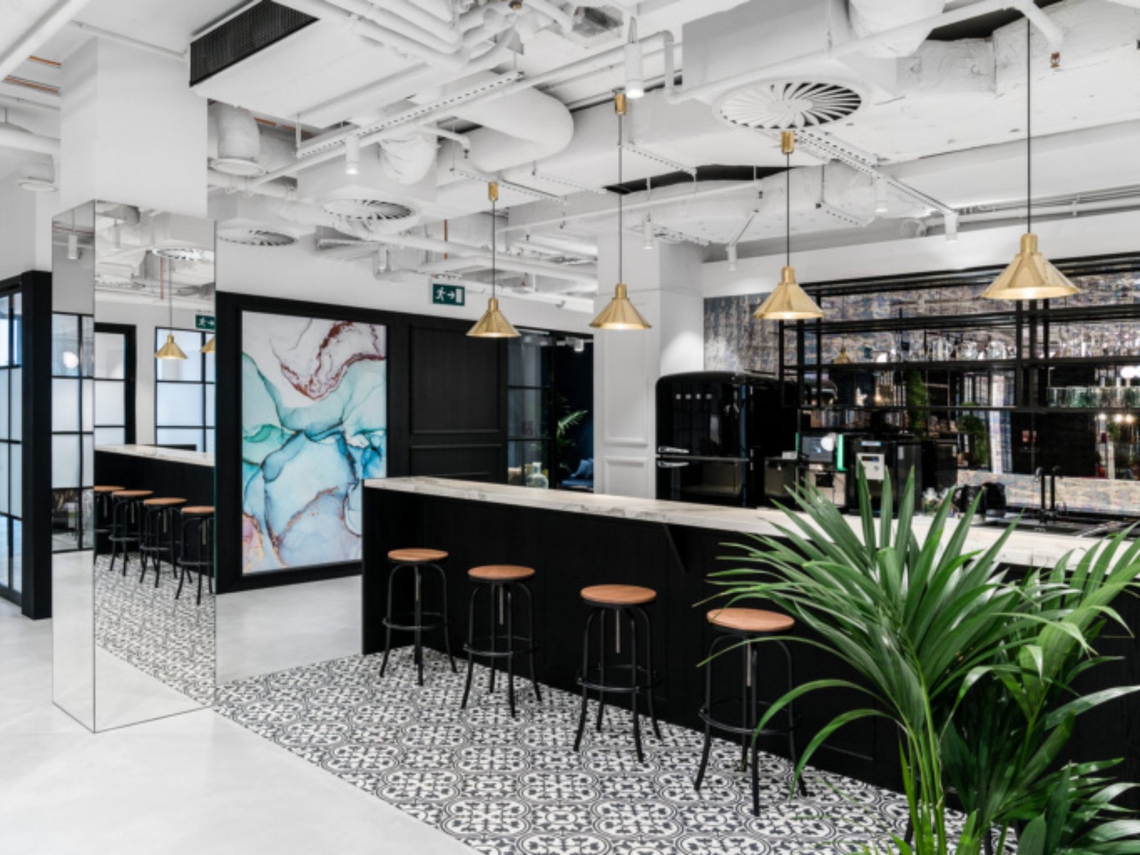 The reception area is spacious and bright, filled with elements of gold, marble and biophilia. At the heart of the office is the bar – a place for meetings and breakouts, as well as a more informal working environment. Also incorporated into the office design are comfortable conference halls, telephone booths, office rooms and open spaces for teamwork. These enable everyone to find the perfect place to work in this cosy, domestic workspace.