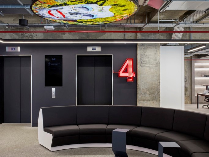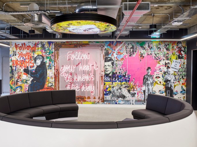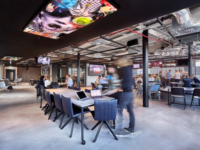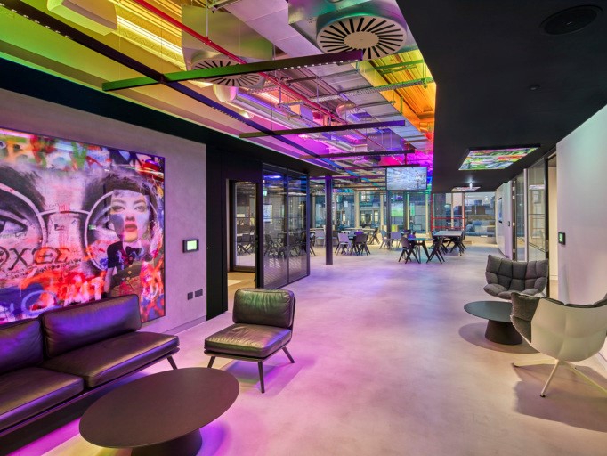 Digital backdrops, light boxes, bright artowrk, hi-tech lighting and projections all have been included in the design of this workspace, creating interactivity. Movement and collaboration is encouraged through circular desks, sofas and reconfigurable work settings.