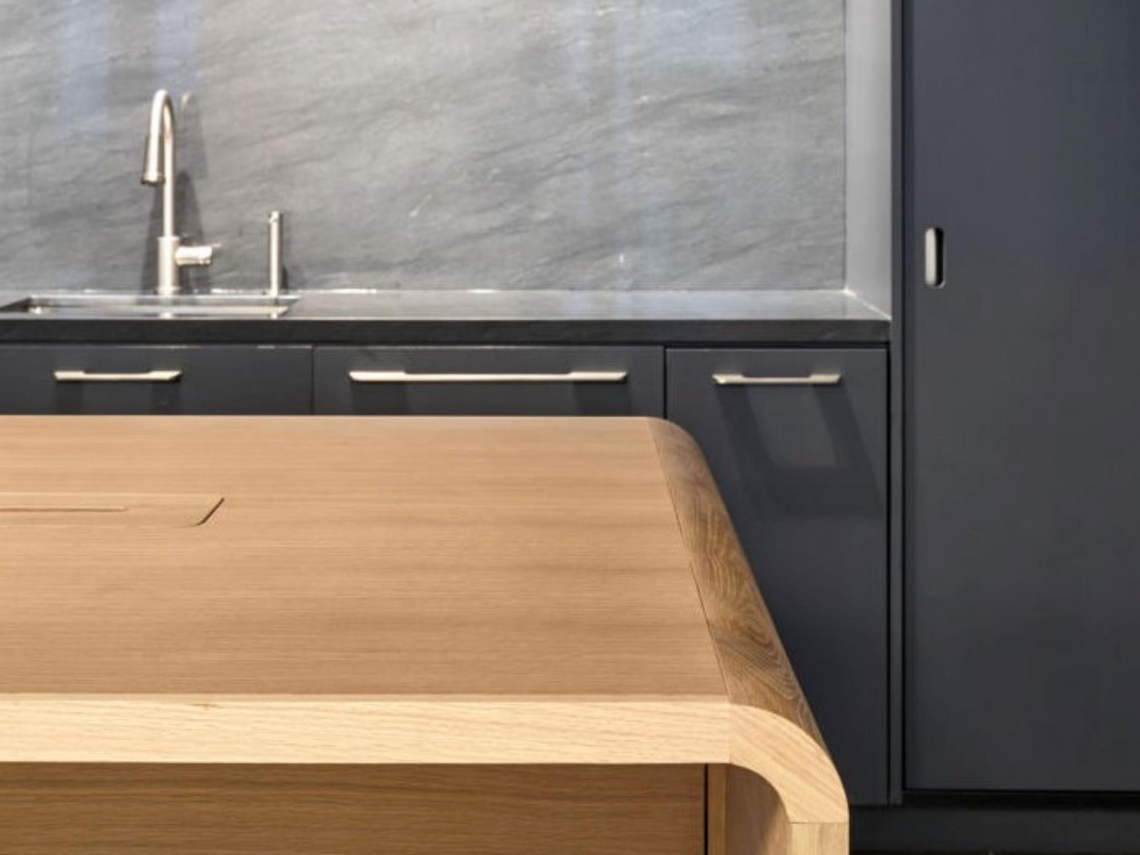 In what has traditionally been a male-dominated industry, the design aesthetic for this investment firm has been softened with the introduction of curves; the suspended light fixtures are circular as are the kitchen counters with their soft fluid edges.