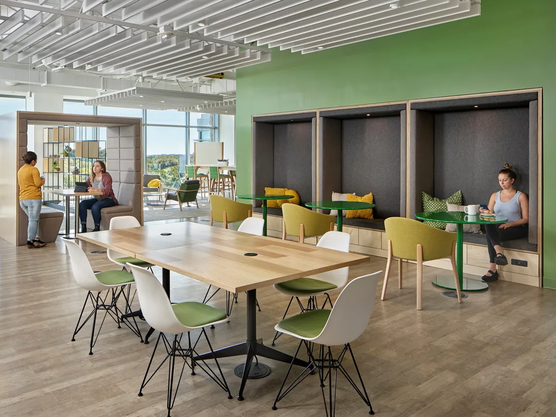 A flexible and collaborative working environment, with a soft and biophillic color palette for world-leading informatio…