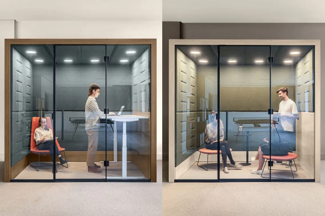The Portals family exemplify a flexible approach to office design. The Portals Studio is a modular booth that can easily transform from a private office into a collaborative area, accommodating diverse work needs and enhanced space-efficiency, as one pod can transform to support multiple functions. With step-free access and internal dimensions accommodating a wheelchair turning circle, it reflects a commitment to accessibility as well as focused work and collaboration.