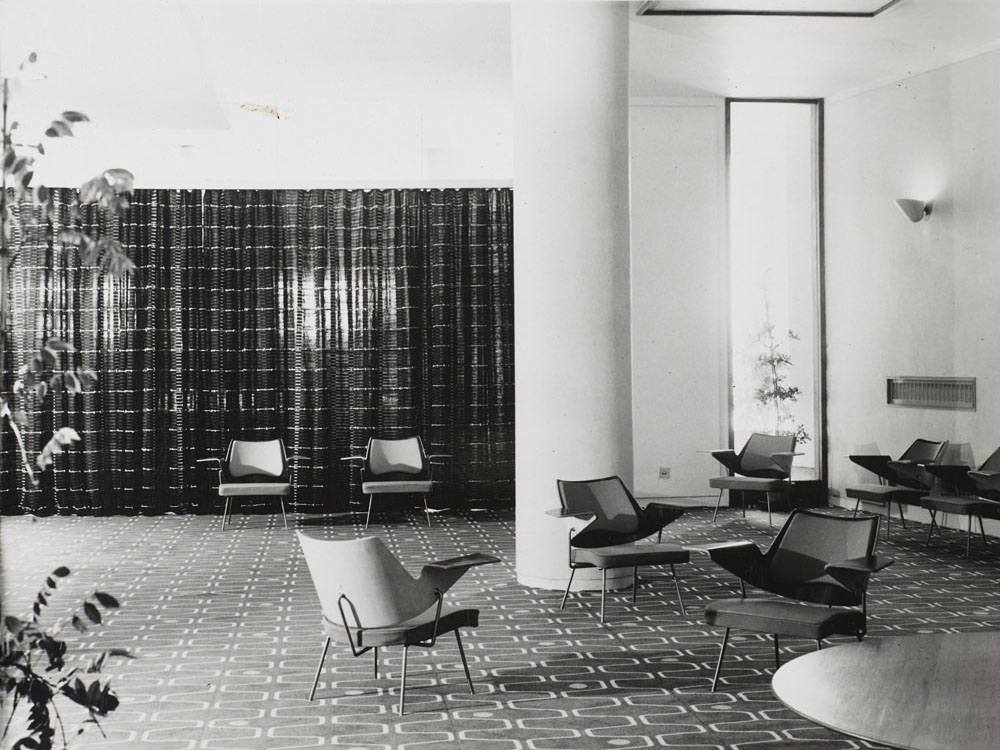 One of the most important figures in London design at the time was Robin Day, who had his breakthrough when he and Clive Latimer won first prize in the International Competition for Low-Cost Furniture Design organised by the Museum of Modern Art, New York. Their winning design was a multipurpose storage unit made from moulded plywood, which could also be folded down into a desk.