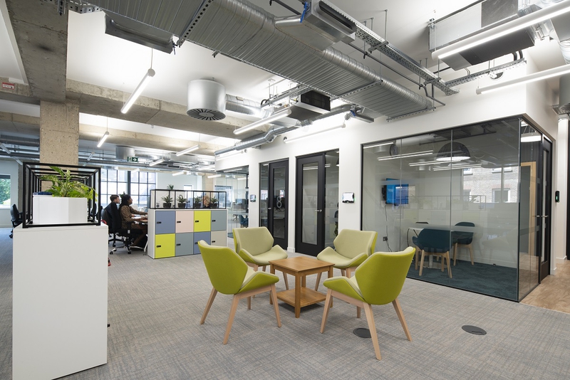 A flexible and collaborative working environment, with a soft and biophillic color palette for world-leading information technology provider, Fujitsu