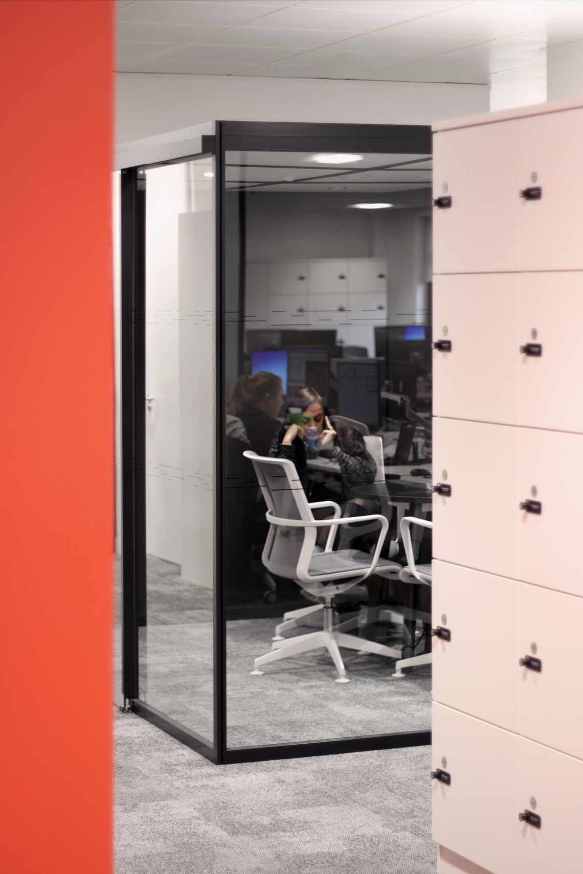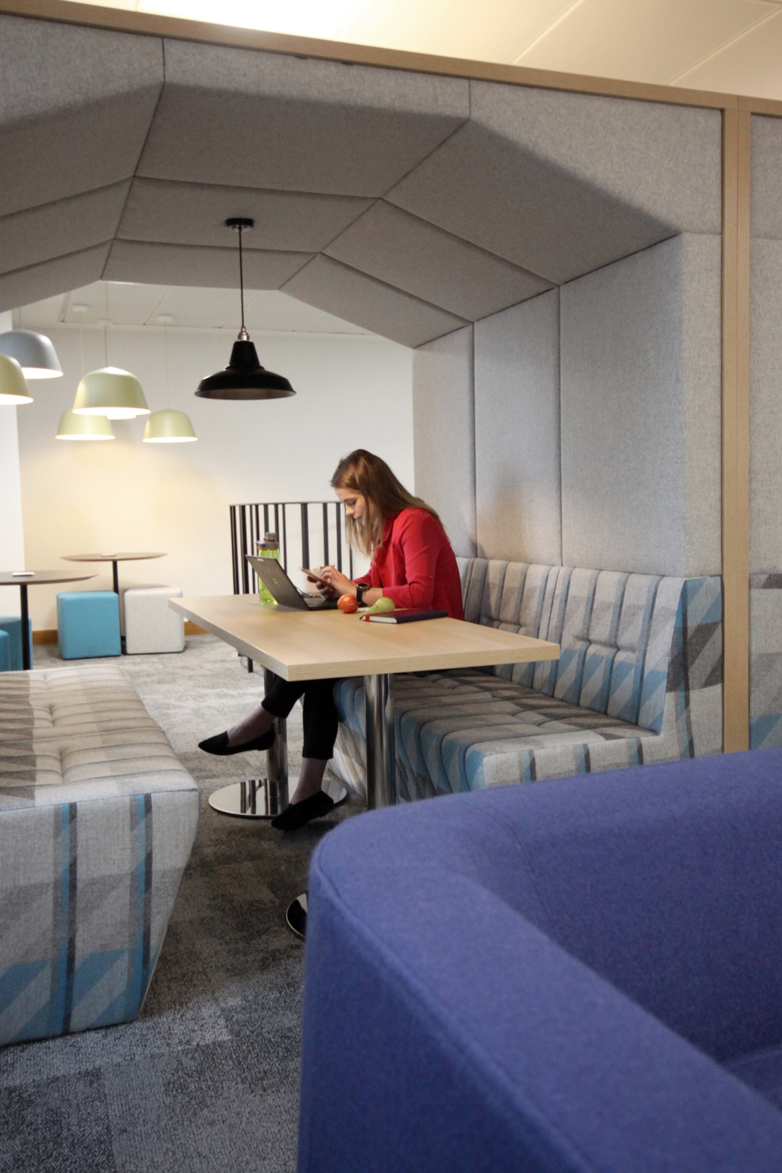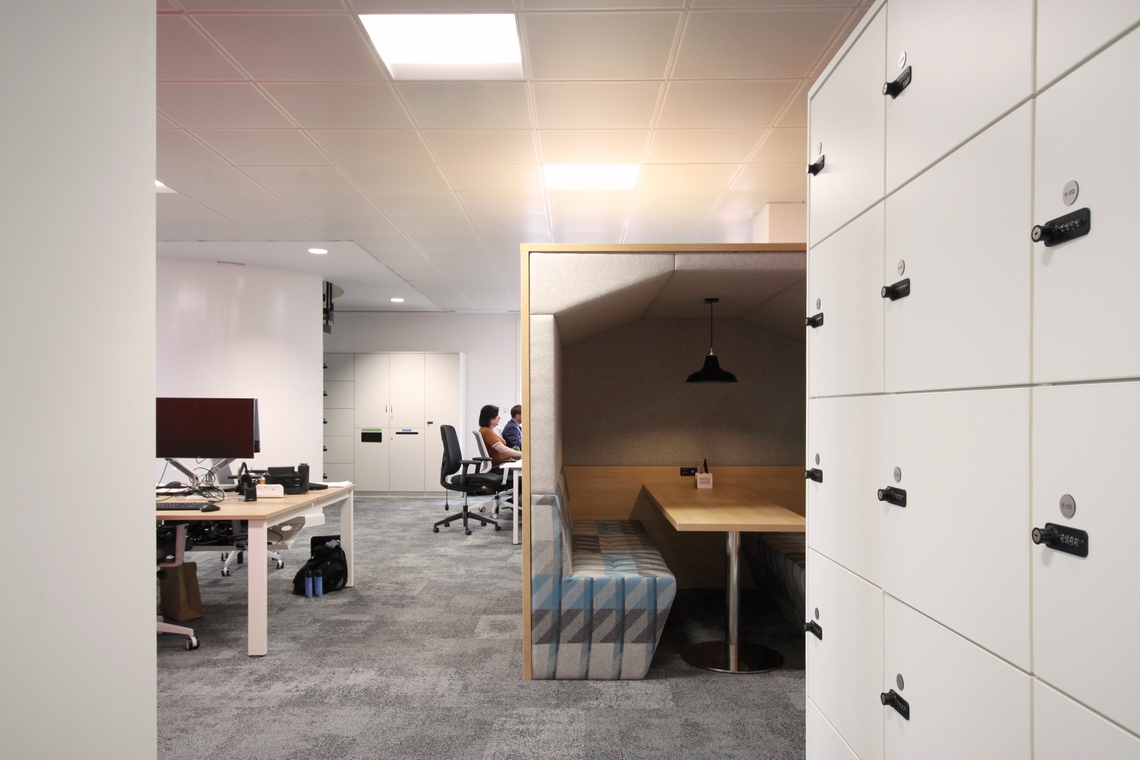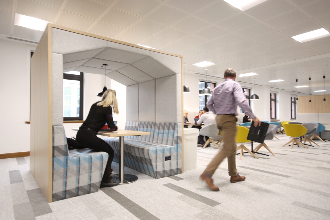 The key to this consolidation was the importance for the new environment to facilitate and catalyse the move to new, more agile working methods. The workplace now supports a 60% agility ratio and the project brief itself looked to create flexible working spaces which gave staff the choice of how they worked. The space has moved away from formal open plan office, with each person having a dedicated work place and meeting spaces, to flexible open plan arrangements and agile work spaces which recognises the changing working practices. The design provided the opportunity for staff to choose an individual quiet space, working within team neighbourhoods, formal meetings or informal meetings within office and client spaces. We were pleased to supply our Railway Carriage booths to provide collaboration hotspots to support this new style of working, as well as providing an area for informal meetings.
