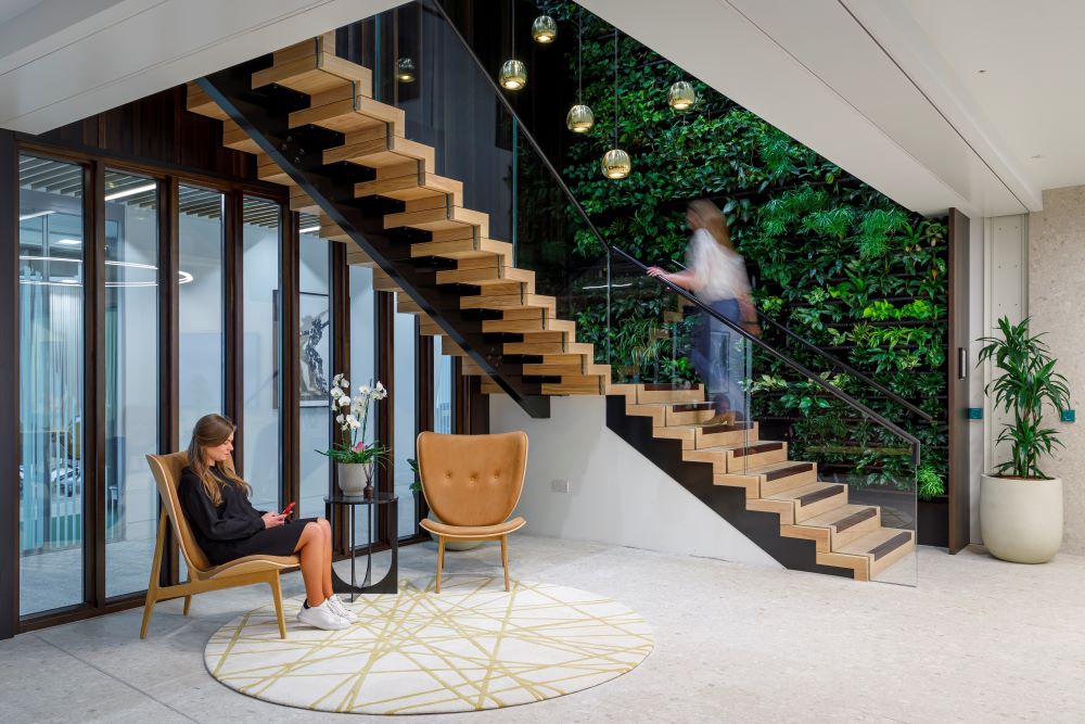 The impressive reception area features a stunning staircase winding its way upwards, flanked by a vertical green wall that spans two floors. A large meeting room, carefully designed to reflect the building’s architecture, offers breathtaking views through arching windows, with soft drapes that lend a welcoming touch. Creative artwork with a modern twist, yet homely appeal, lines the walkways, providing soothing sightlines throughout the office.