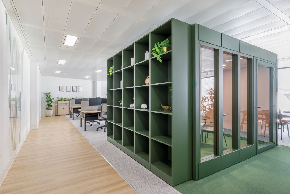 Portals Quiet booths in sage green were also incorporated to provide a peaceful escape for focused tasks, enhancing productivity without breaking the design flow and feel.