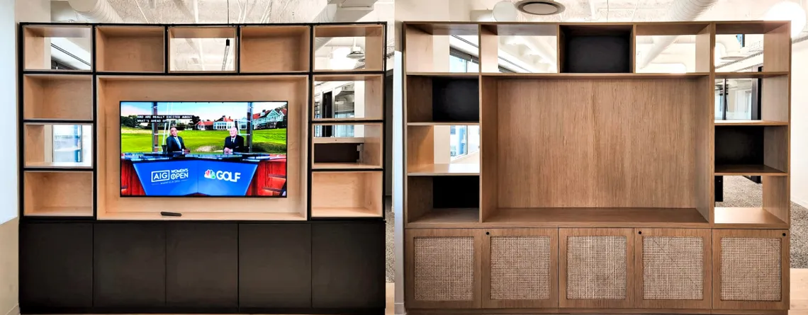 Spacestor worked with Interior Investments and Gensler to supply with Palisades II with integrated AV units and storage. With endless possibilities, Palisades II can be customized to align with and complement any design scheme whilst adding value to the space for employees. Allowing for the creation of space without cutting it off, Spacestor also supplied their Palisades Wood, in a beautiful warm oak finish with custom rattan doors to provide an exquisite, softly familiar look.
