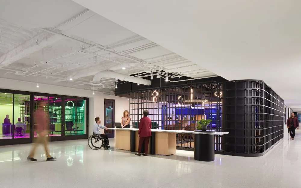 The organization’s signature colors are presented through furniture and wall features, including an expansive mural, championing purple as a backdrop to a brightly colored collaboration area. Sarah Adams, Design Director at Gensler explains, “the glittering spectrum of light the city reflects served as inspiration for the color and finishes throughout the space, with architectural elements and textures seen throughout the vibrant neighbourhoods of Chicago, creating a unique human-centric experience on each floor.”