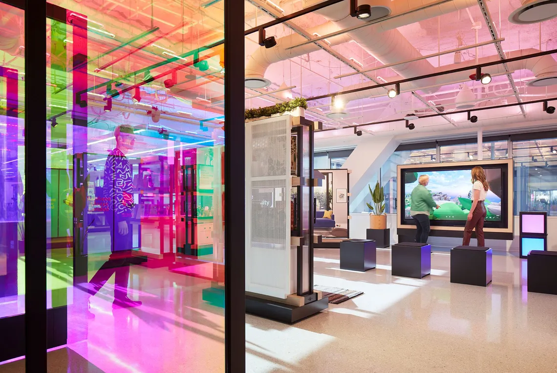 This spectrums representation takes a futuristic turn in the maker lab space which spans floors 20 to 26. With immersion rooms, labs, production spaces and a broadcast studio, the floors are characterized by exposed ceilings glowing with gradient light, huge touch screens, machinery, and dichroic glass panels. Areas energetically encourage collaboration and innovation with a flexible working environment which allows employees to adapt their surroundings to suit their activities.