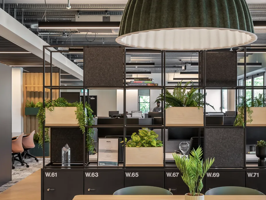 This space exudes a warm and inviting atmosphere with the use of natural materials and textures and biophilia carefully placed throughout. The palette of greens and pinks brings softness, contrasting with the defined lines of more architectural features, such as the black window and glass wall frames, and our zone dividers.