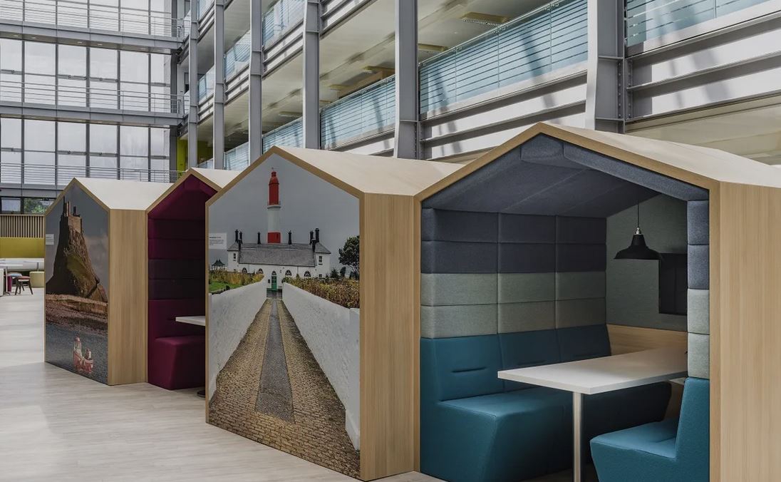 The triple-height atrium that runs the length of the building, soaks the space with natural light from the vast, glass ceiling above. This overabundance of light creates an open and inviting avenue through the centre of the space, that is finished with a range of collaboration spaces. Through the centre of the avenue, the space features several runs of our Railway Carriages. Customized with beachhut graphics and a seaside-feel, these booths are perfect for solo working or collaborative meetings, and feature stunning prints of the North England's dynamic landscape. The acoustic properties of the booth provide sound insulation and a sense of privacy insulated with acoustic absorbing panels to provide solace from the open space, yet also a sense of privacy for those using the meeting space. Integrating a monitor into each of the Railway Carriages allows staff to seamlessly work from wherever they choose.