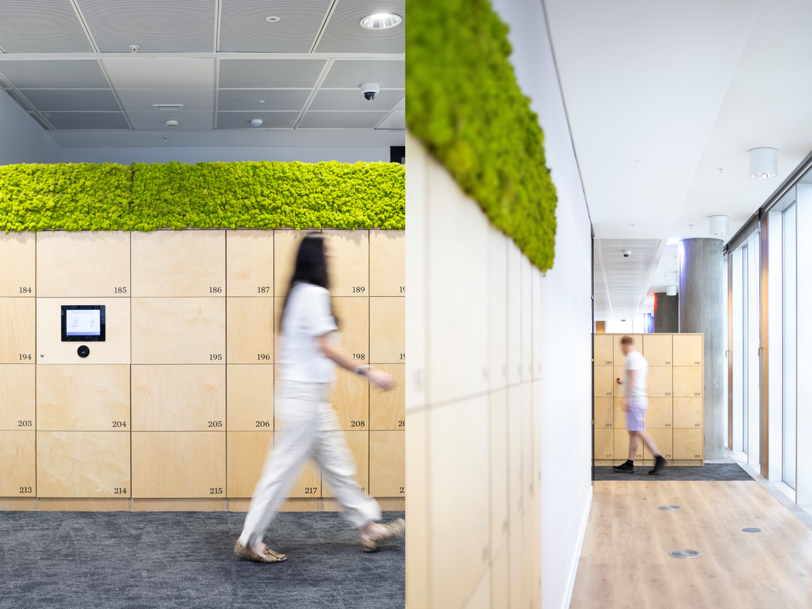 An existing installation of Hotlocker Forte was kept in this building, with its quality build allowing longevity and re-use over and over, a sustainable solution that saves on materials being used. The planter panels on top, with the light woodgrain finish bring a calming feel with the colour and texture, along with the natural light from the floor-to-ceiling windows.