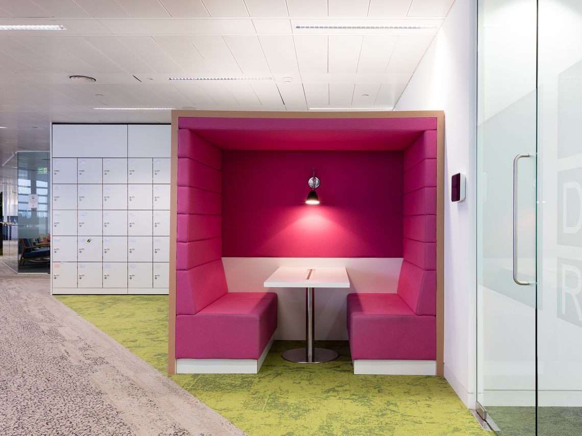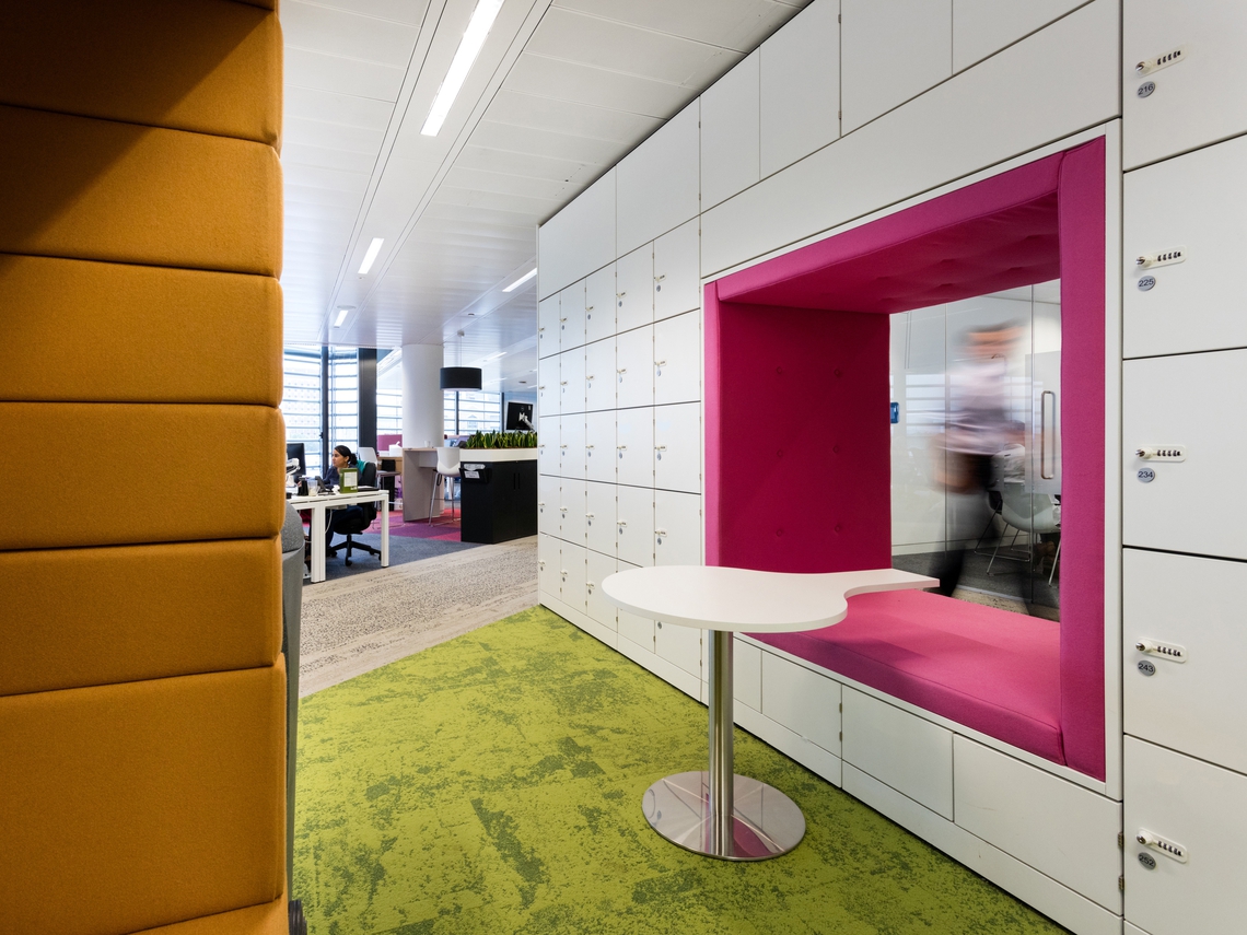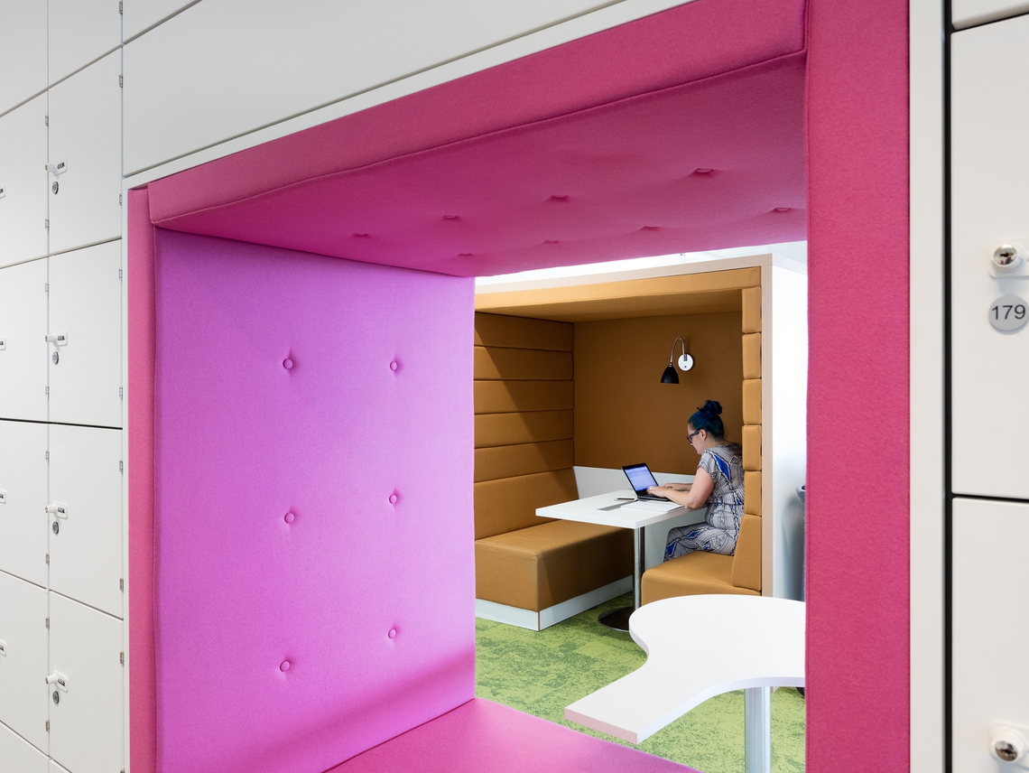 Il était essentiel de créer un choix d'espaces multi-usage ainsi des Railway Carriages ont été installées comme endroit où collaborer et être créatif et des assises Snugglestor ont été intégrées dans des Storagewalls et des rangées de HotLockers comme endroit où se concentrer et se détendre. Comme les designers de Peldon Rose expliquent : "Le fait d'assembler des assises souples, des cabines où se retirer et de plus petites cabines pour se concentrer dans l'espace principal des bureaux et dans la zone des casiers aide à rompre les contraintes d'un bureau traditionnel et donne un espace entièrement utilisable."