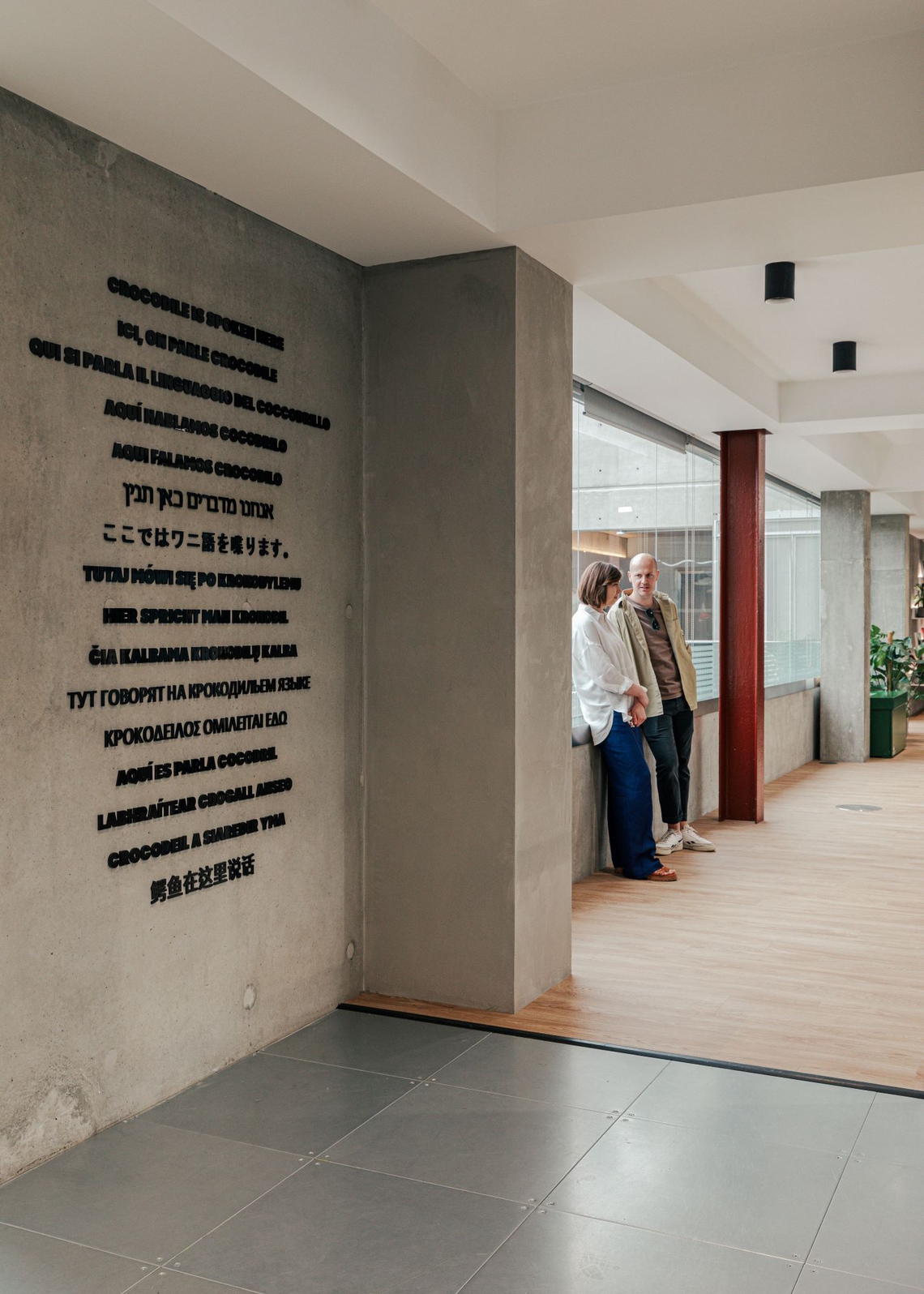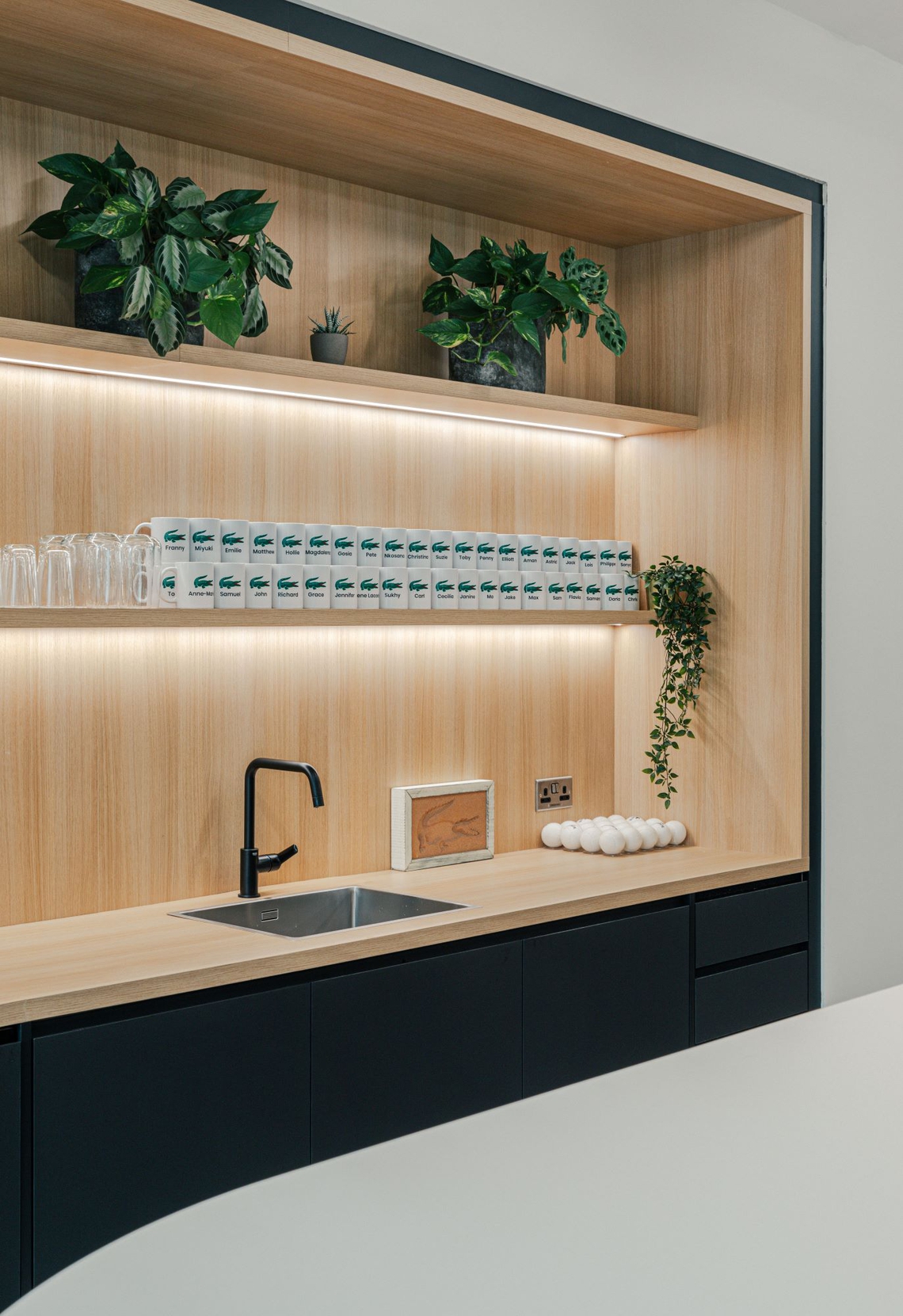 Signature branding and vibrant pops of color tie the design together, ensuring that the space is not just a functional office but a true reflection of the brand’s personality. Imagery and vintage sports equipment from when Lacoste played tennis in the 1930s decorate and characterise the area, as well as a number of crocodile visual references, reflecting the heritage of the brand story. This includes a couple of large model crocodiles around the office, branded green storage boxes, as well as personalised branded mugs for every colleague in the kitchen. The branding even extends to the detail of crocodile-shaped pincushions in the colour and materials room! Contributing to the community feel, and capturing the inclusive, global culture, is the phrase ‘Crocodile is spoken here’ up on the wall in 16 different languages, as a playful touch.