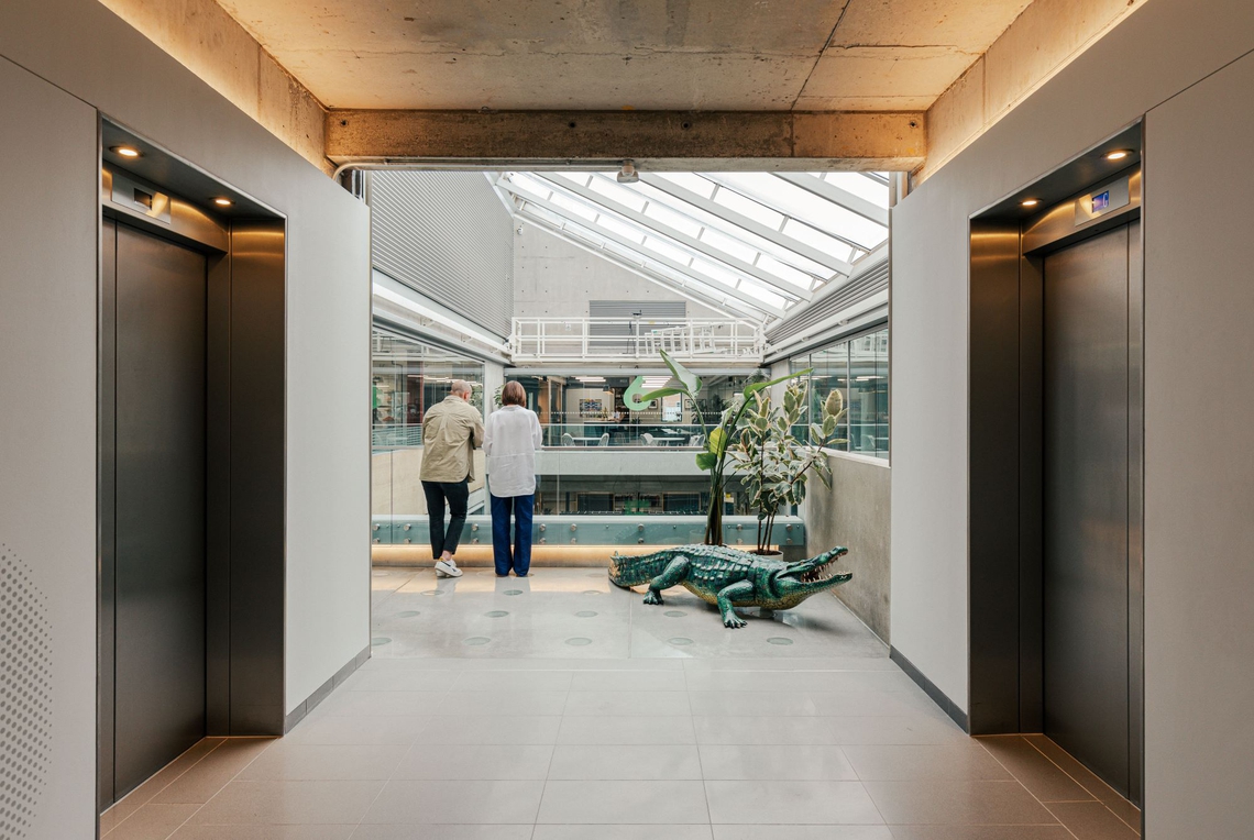 The office space, inspired by a New York warehouse aesthetic, is a striking blend of industrial aesthetics and modern design, with raw, exposed surfaces and clean, sharp lines that define the environment. Concrete forms the backbone of the space, while bold red steel pillars inject a dynamic burst of color, seamlessly maintaining an industrial loft feel. The design embraces openness, with expansive windows and glazing that invite natural light into every corner, especially around the open atrium/gallery at the heart of the space. This openness creates an airy, welcoming atmosphere, allowing the space to breathe. It also enhances the sense of connection between teams and colleagues, around this focal point in the office, where everyone is equally involved.