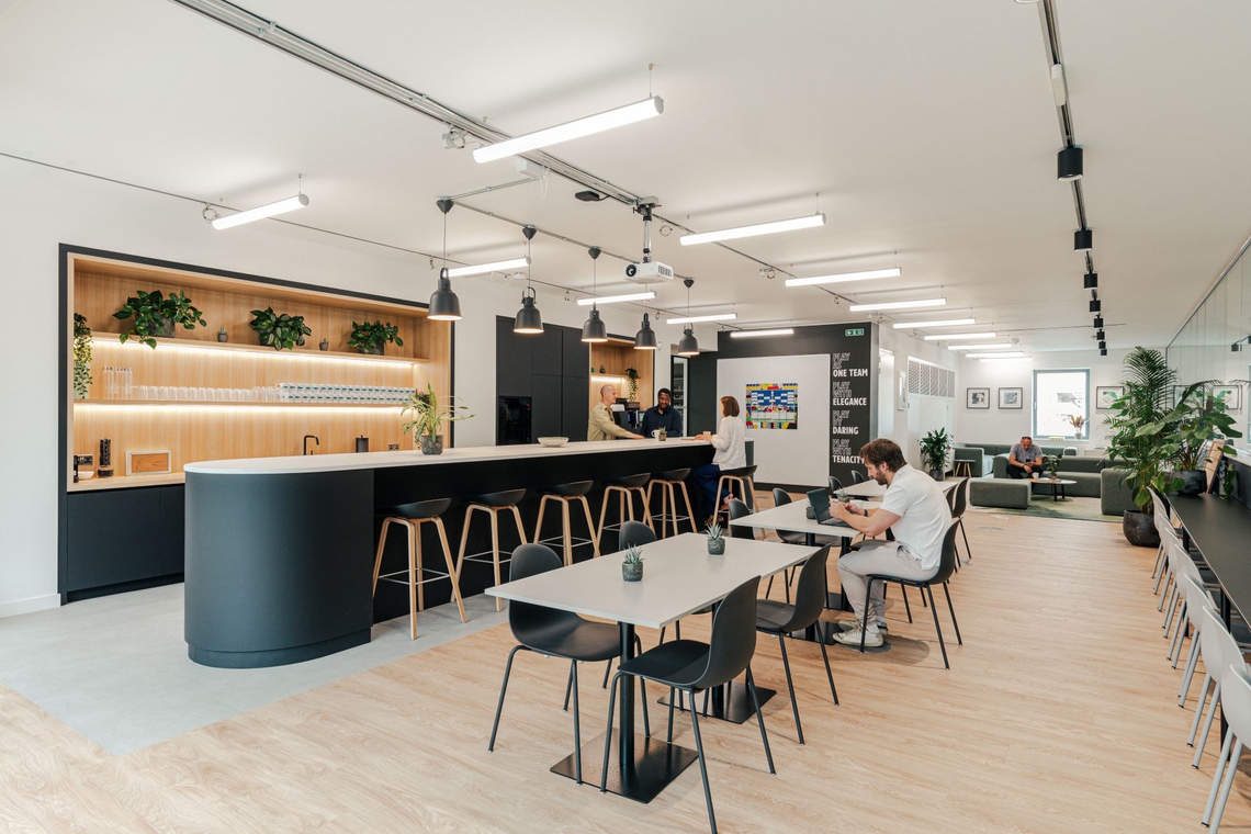To ground the design, deep black accents are used throughout—bold black typography, furniture, and fittings—contributing to a sleek and contemporary look. Acoustic panelling is thoughtfully integrated, absorbing sound while maintaining the visual energy of the space. The strategic incorporation of biophilia throughout softens the sharp edges, bringing in a touch of nature that contrasts beautifully with the industrial elements.