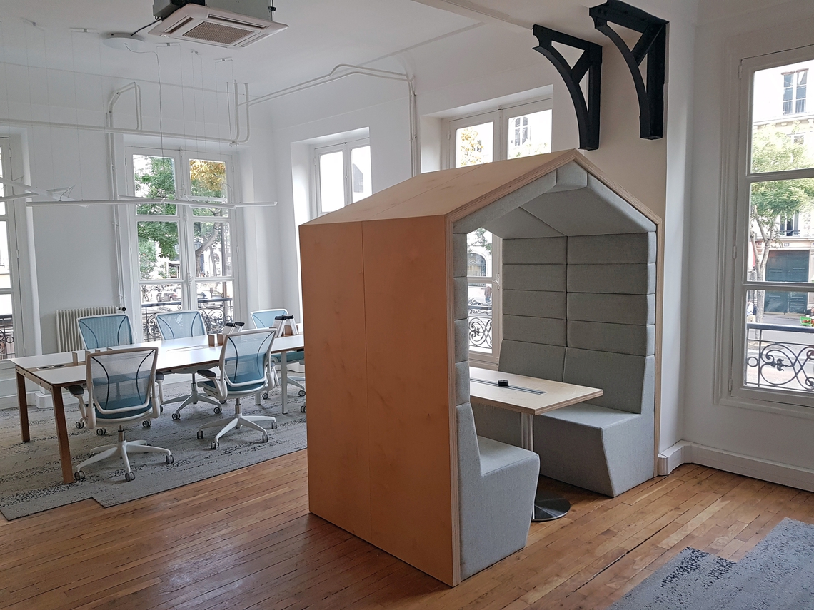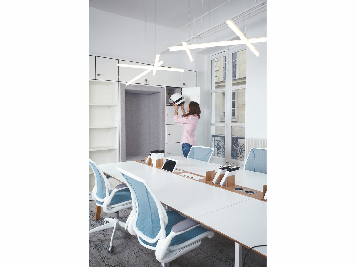 Pour renforcer ce concept de travail collaboratif, nous avons installé une Railway Carriage avec toit incliné et sans panneau arrière offrant un endroit où les employés peuvent tenir des réunions informelles et partager des idées. Les cabines ont été personnalisées pour correspondre à l'aspect minimaliste de la marque. Nous avons aussi augmenté l'espace de stockage dans les bureaux avec le Storagewall de Spacestor et un Snugglestor intégré dans le mur, créant un perchoir social pour le bénéfice du personnel.